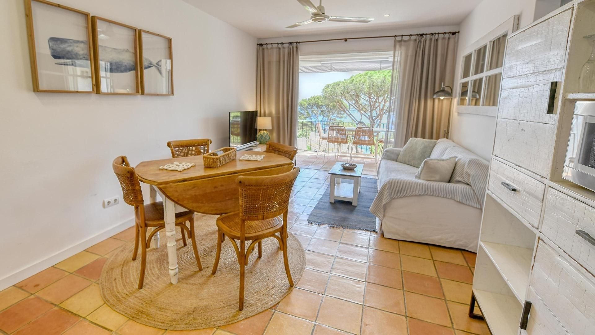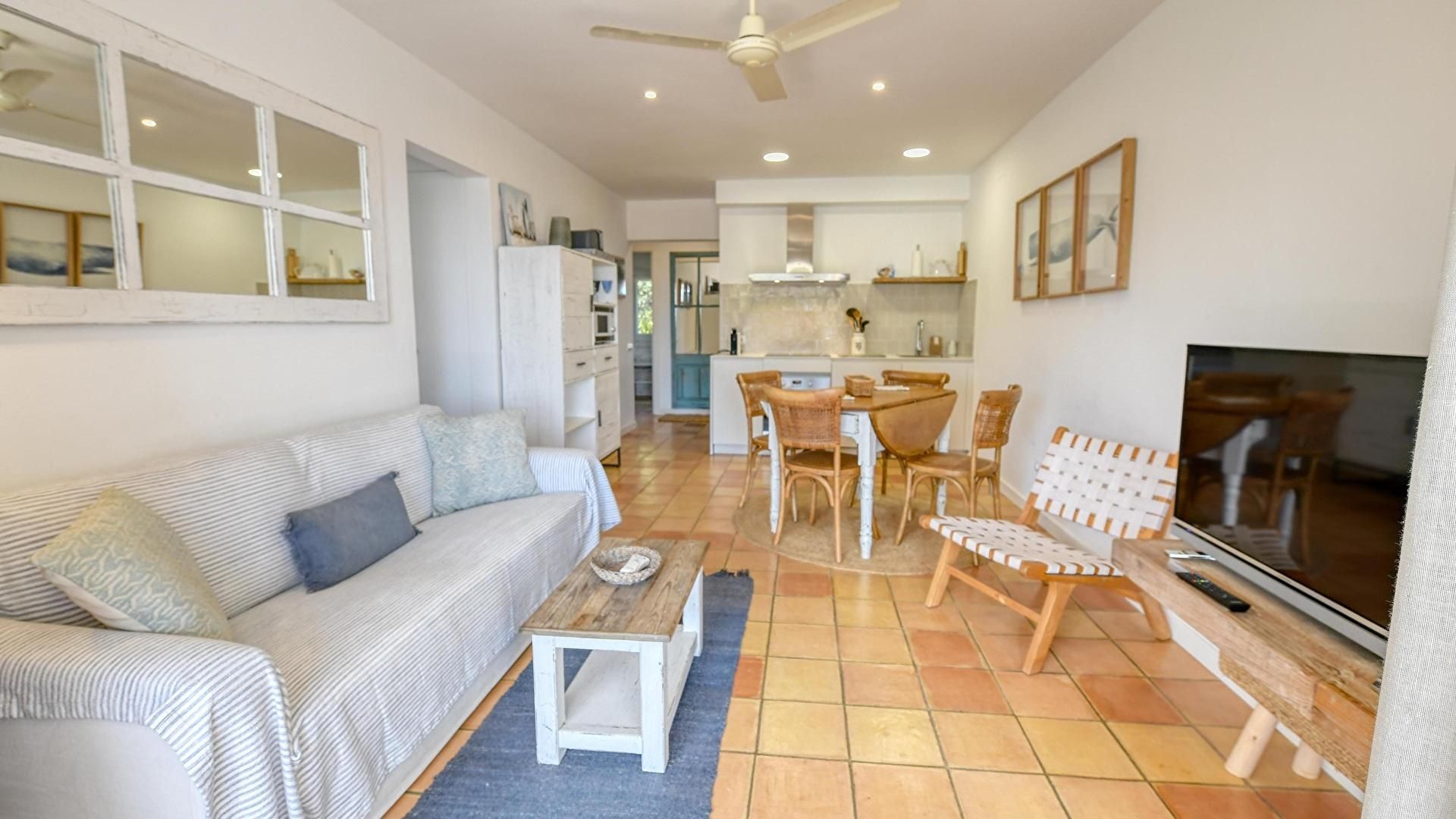 - Sala de estar con televisor, salida a la terraza, ventilador en el techo, radiador eléctrico y vistas al mar.