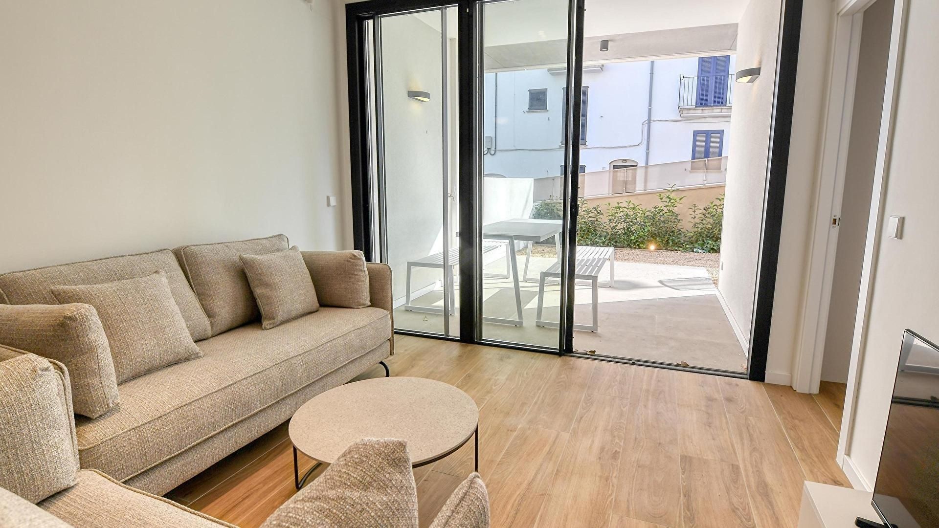- Sala de estar con televisor y salida a la terraza.