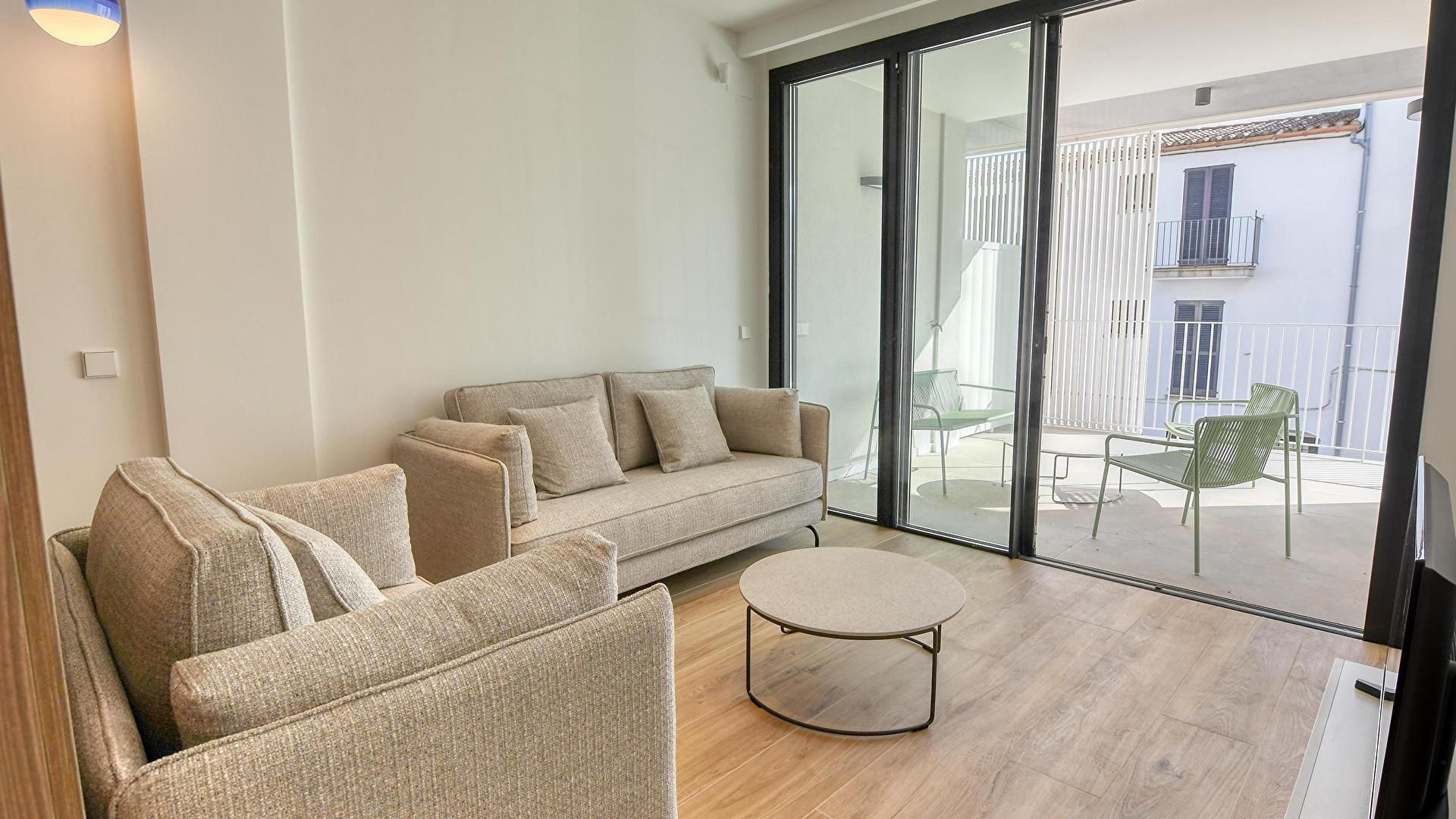 - Sala de estar con televisor y salida a la terraza.