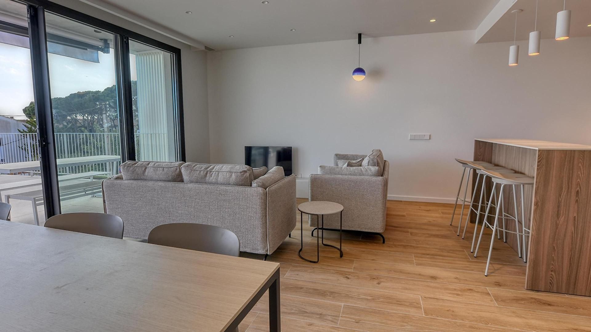 - Sala de estar con televisor y salida a la terraza.