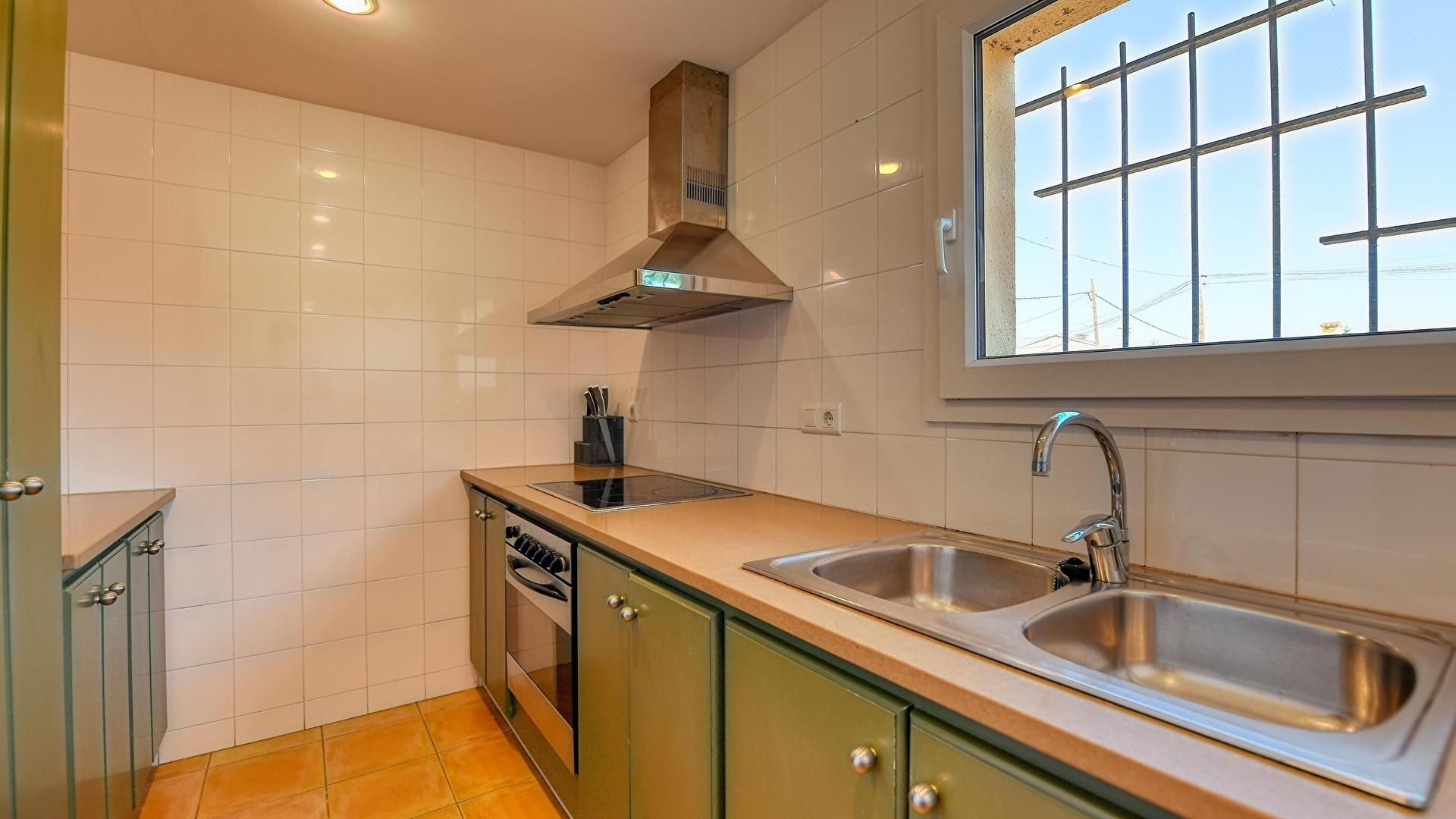 - Cocina con encimera vitrocerámica, horno, microondas, nevera y lavadora.