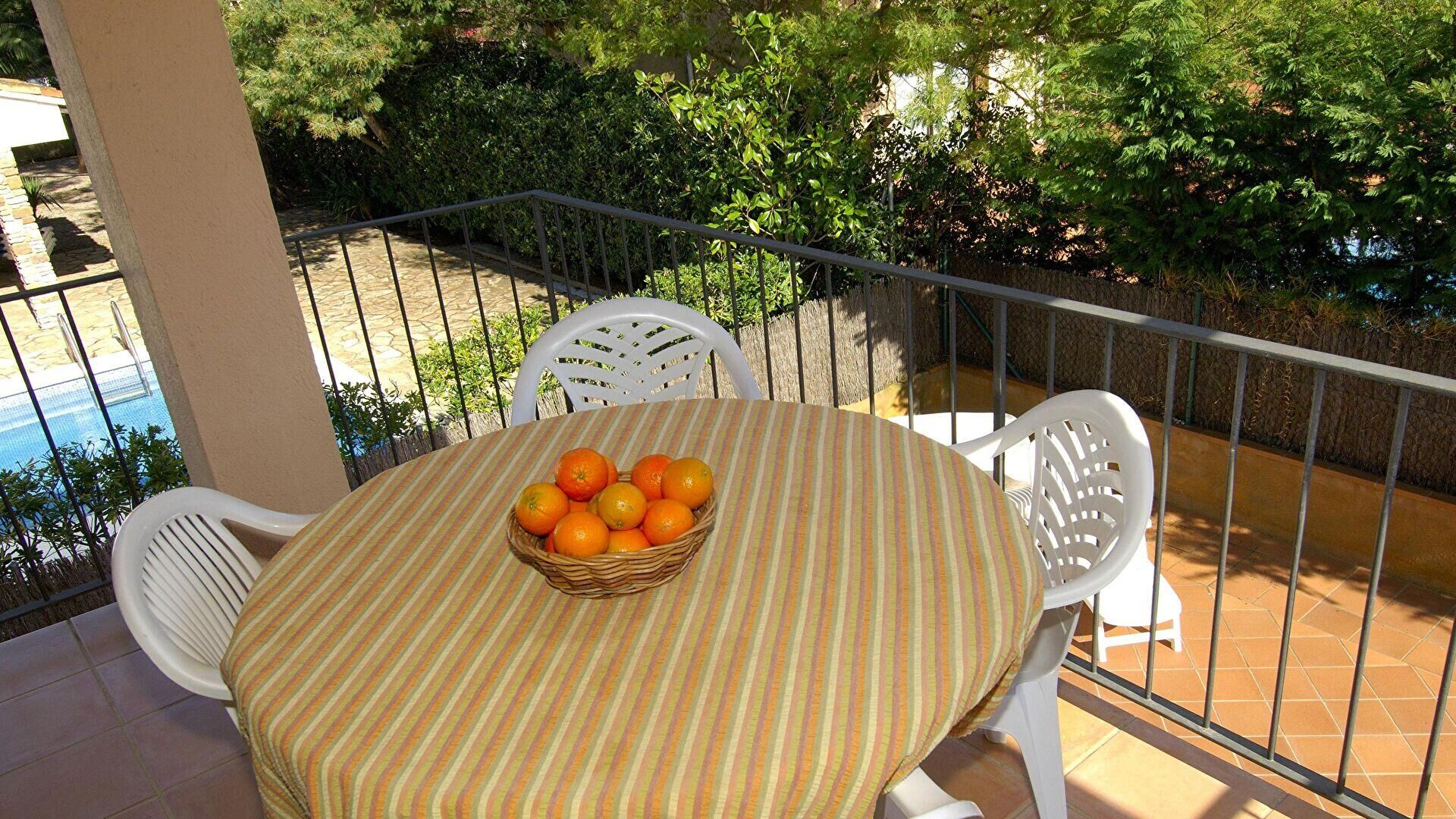 Piscina comunitaria y muebles de terraza.