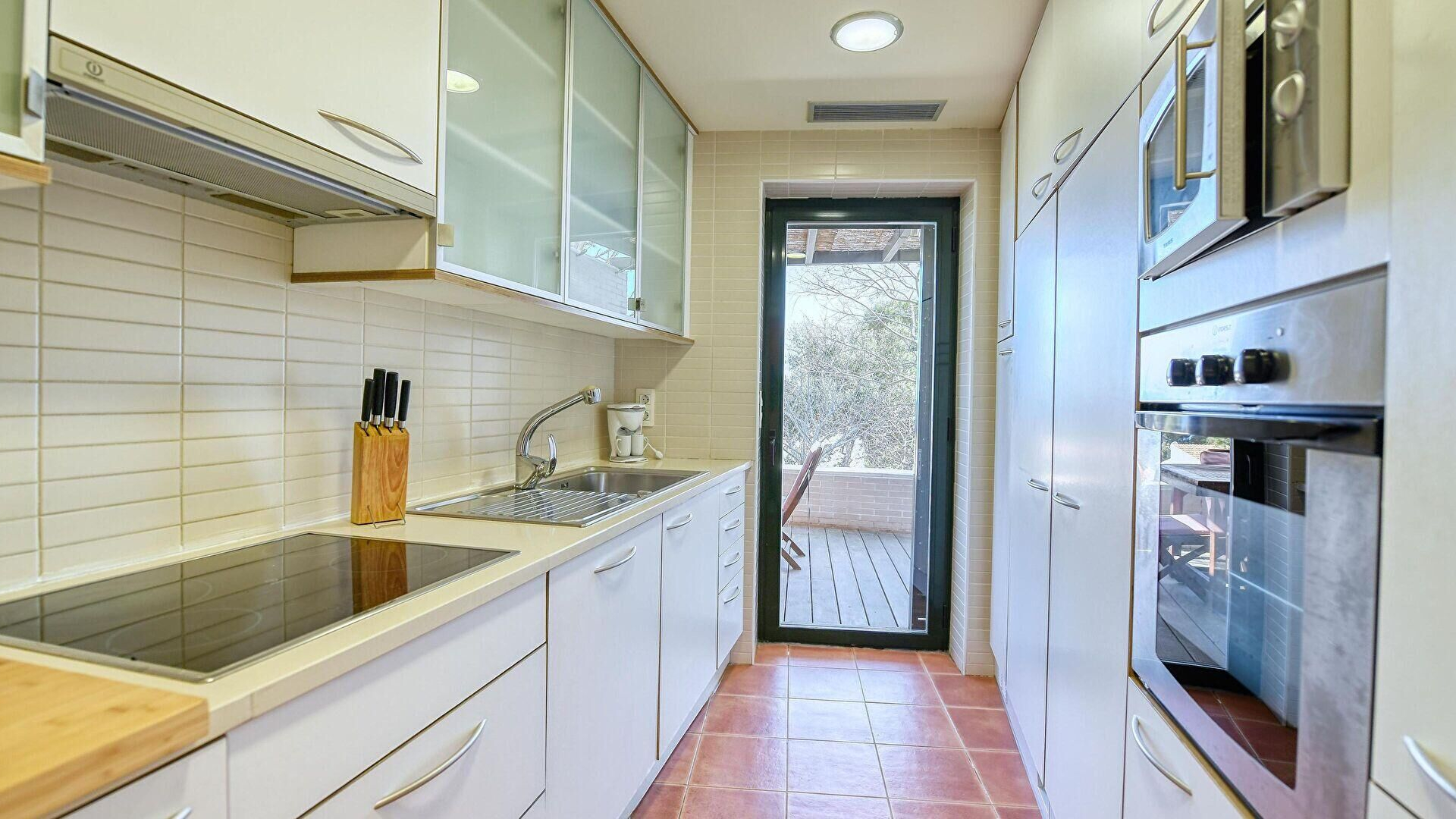 - Cocina con encimera vitrocerámica, horno, microondas, lavadora, secadora, lavaplatos y nevera.