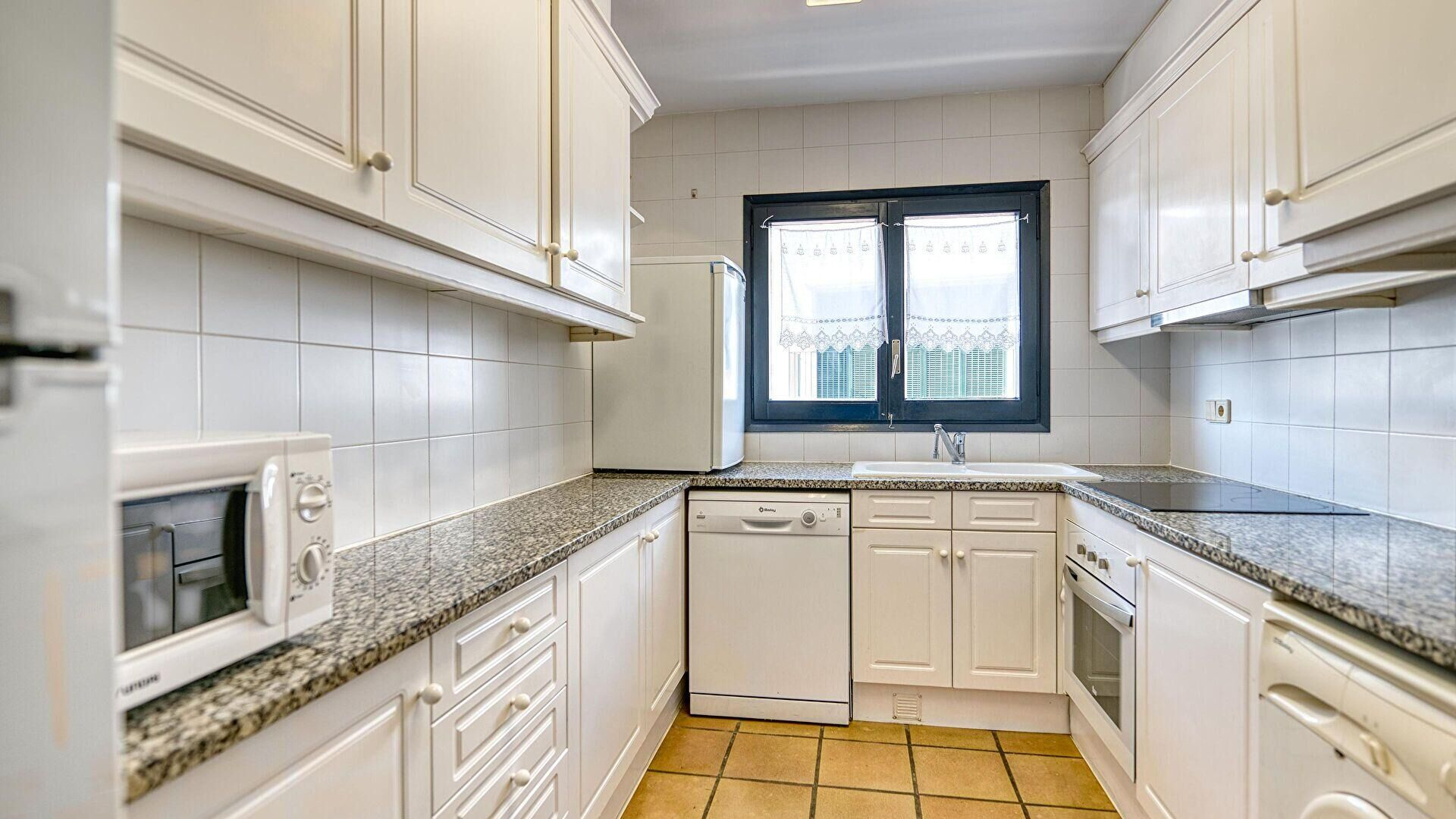- Cocina con encimera a gas, horno, nevera, lavaplatos y lavadora.
