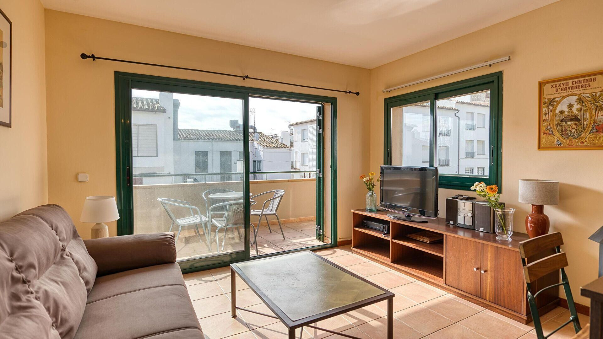 - Comedor-estar, chimenea, televisor y salida a la terraza.