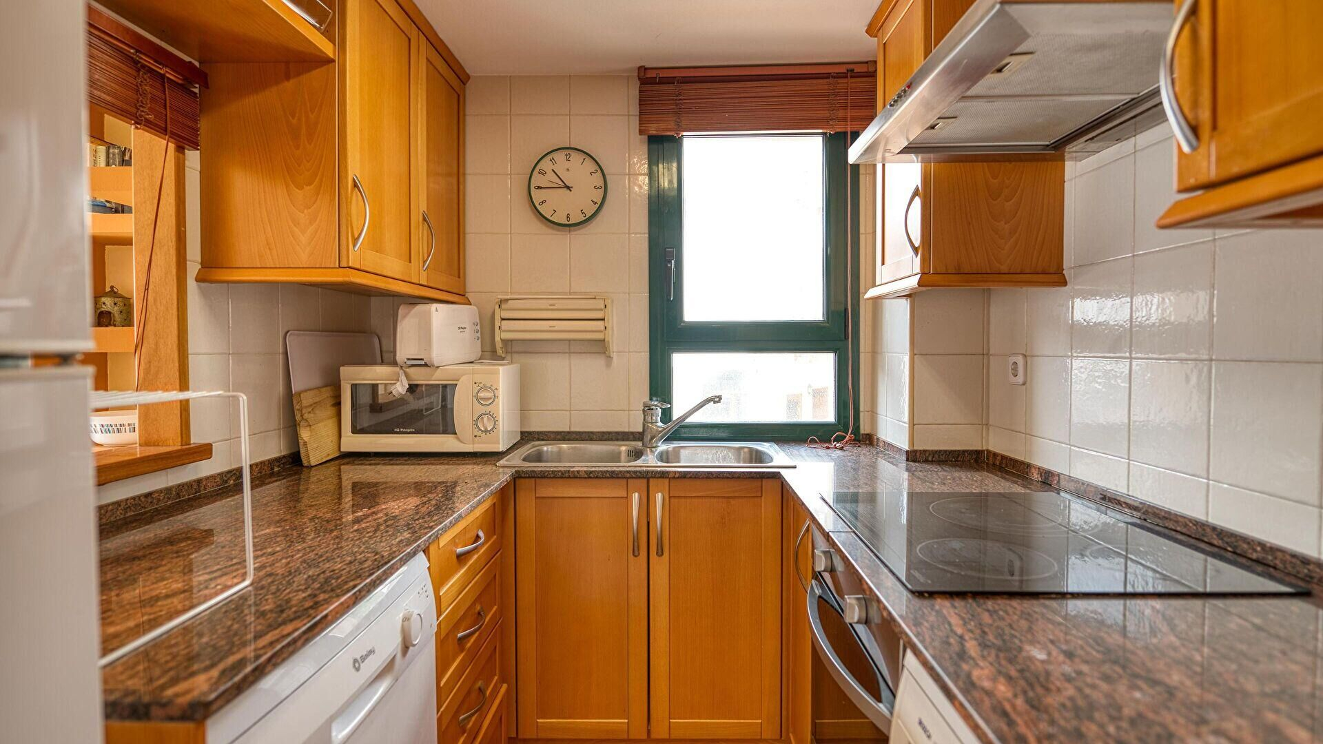 - Cocina con encimera vitrocerámica, horno, microondas, nevera, lavaplatos y lavadora.