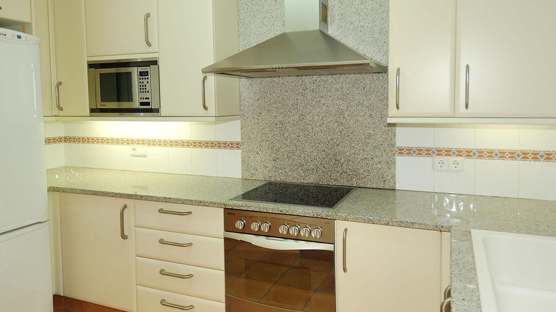 - Cocina americana con encimera vitrocerámica, horno, microondas, combi, lavaplatos y lavadora.