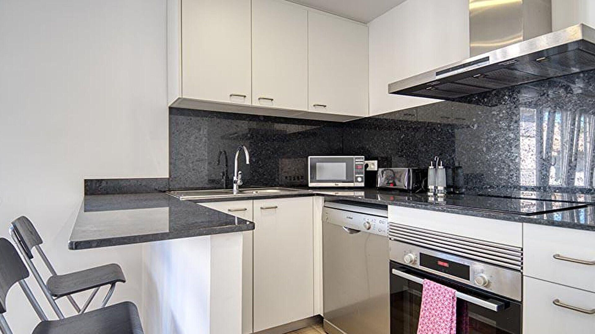 - Cocina americana con placa de inducción, horno, microondas, plancha, combi y lavaplatos.