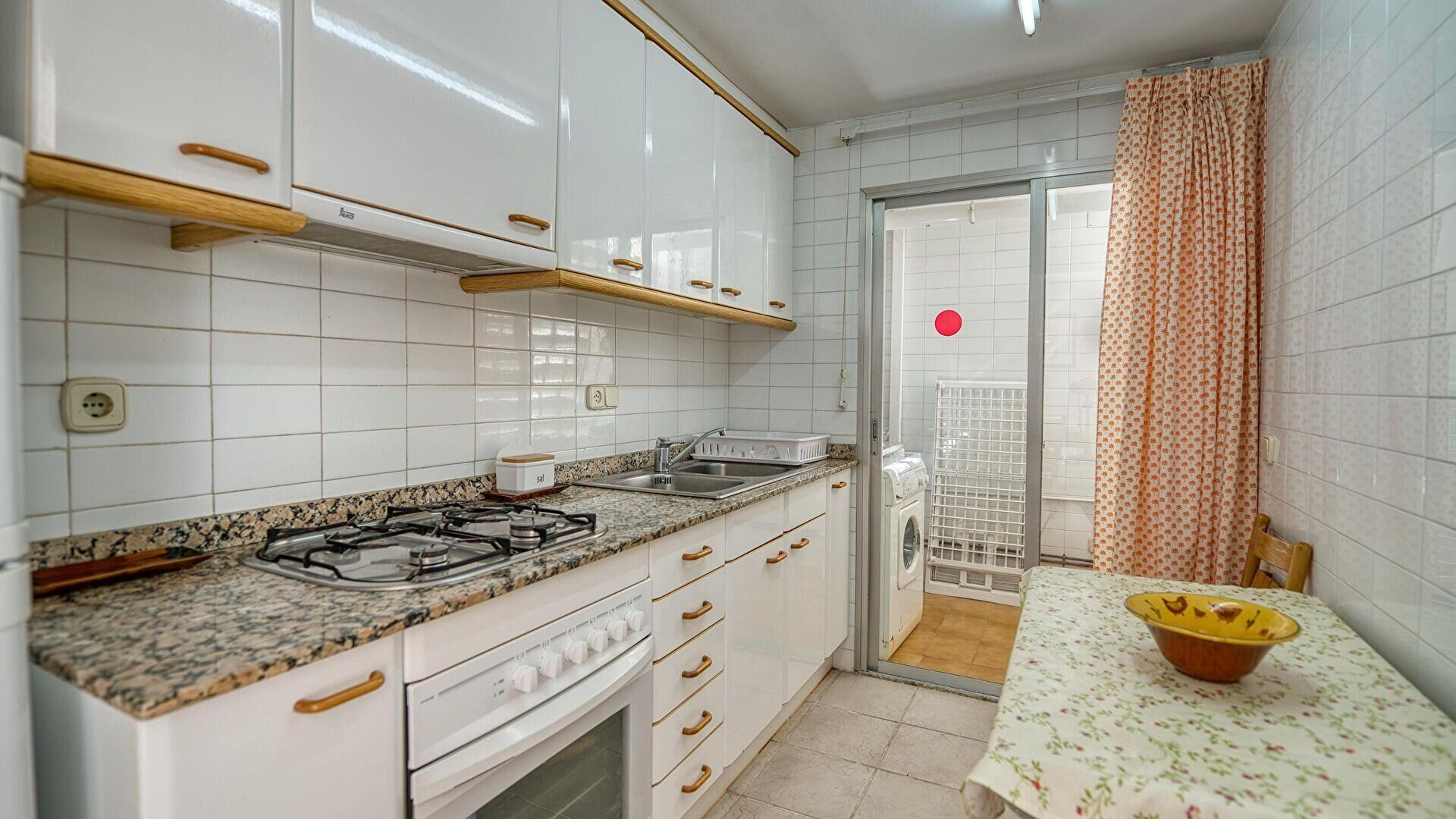 • Cocina con encimera a gas, horno, microondas, nevera y lavadora.