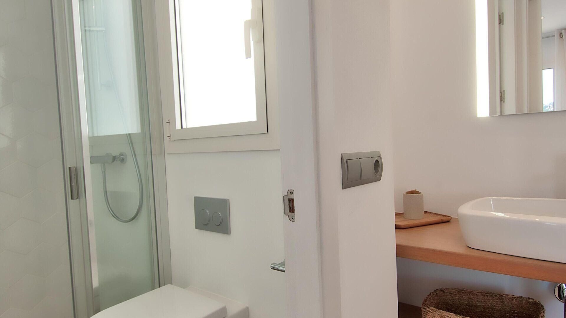 - Dormitorio con 1 cama de matrimonio, radiador eléctrico, salida a la terraza y baño con ducha (en suite).