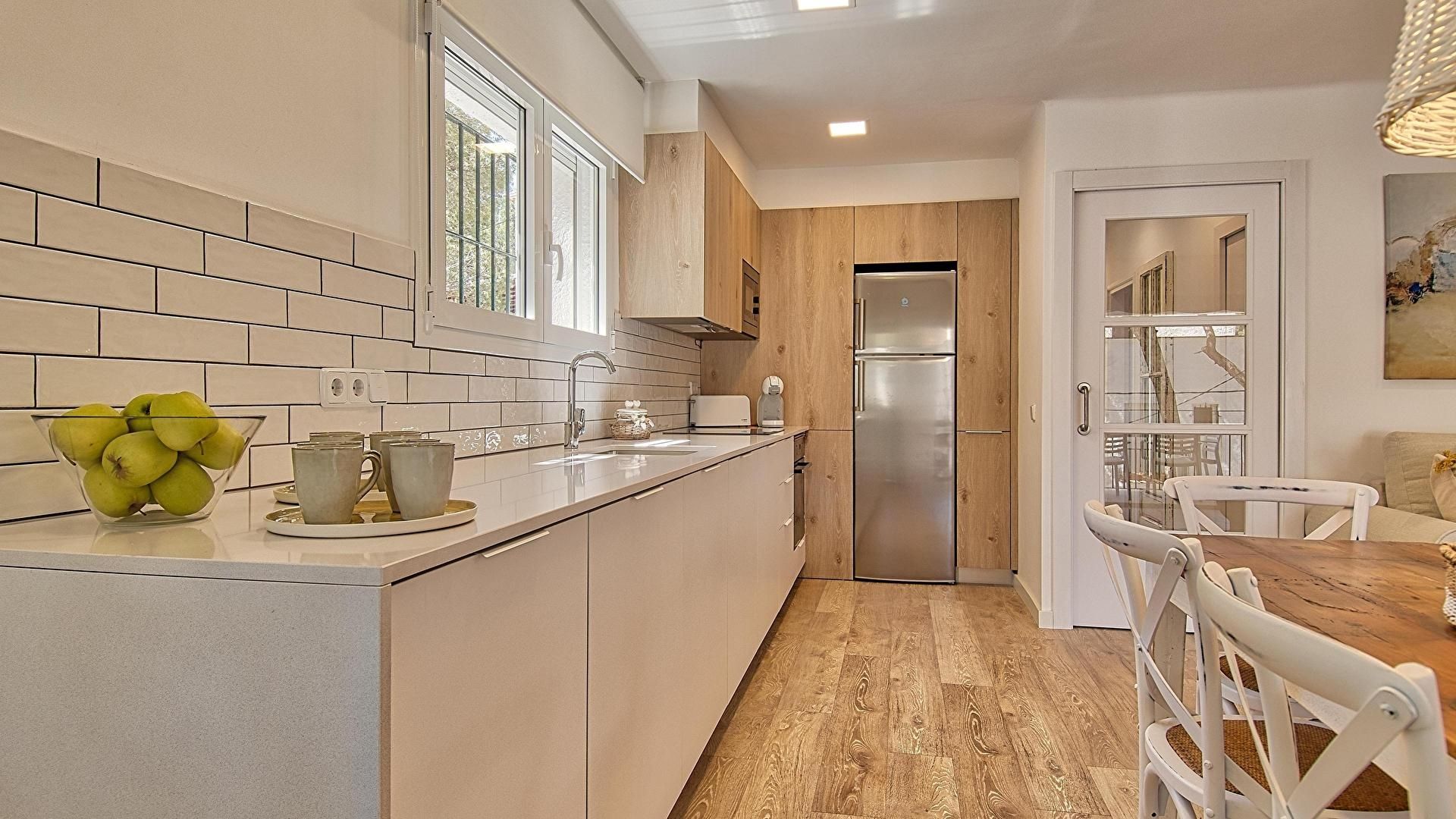 - Cocina americana con encimera vitrocerámica, horno, microondas, nevera, lavadora y lavaplatos.