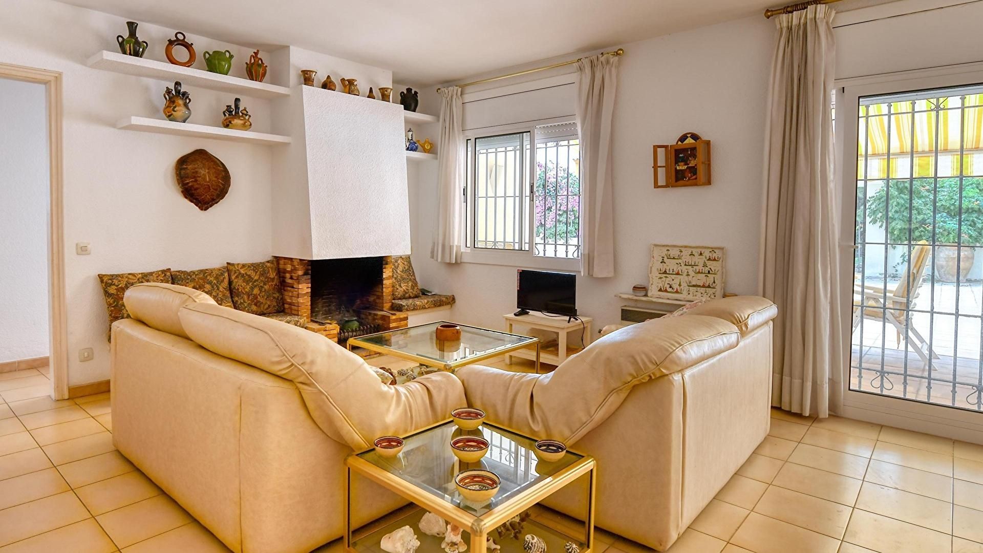Menjador-estar amb llar de foc i sortida a la terrassa.