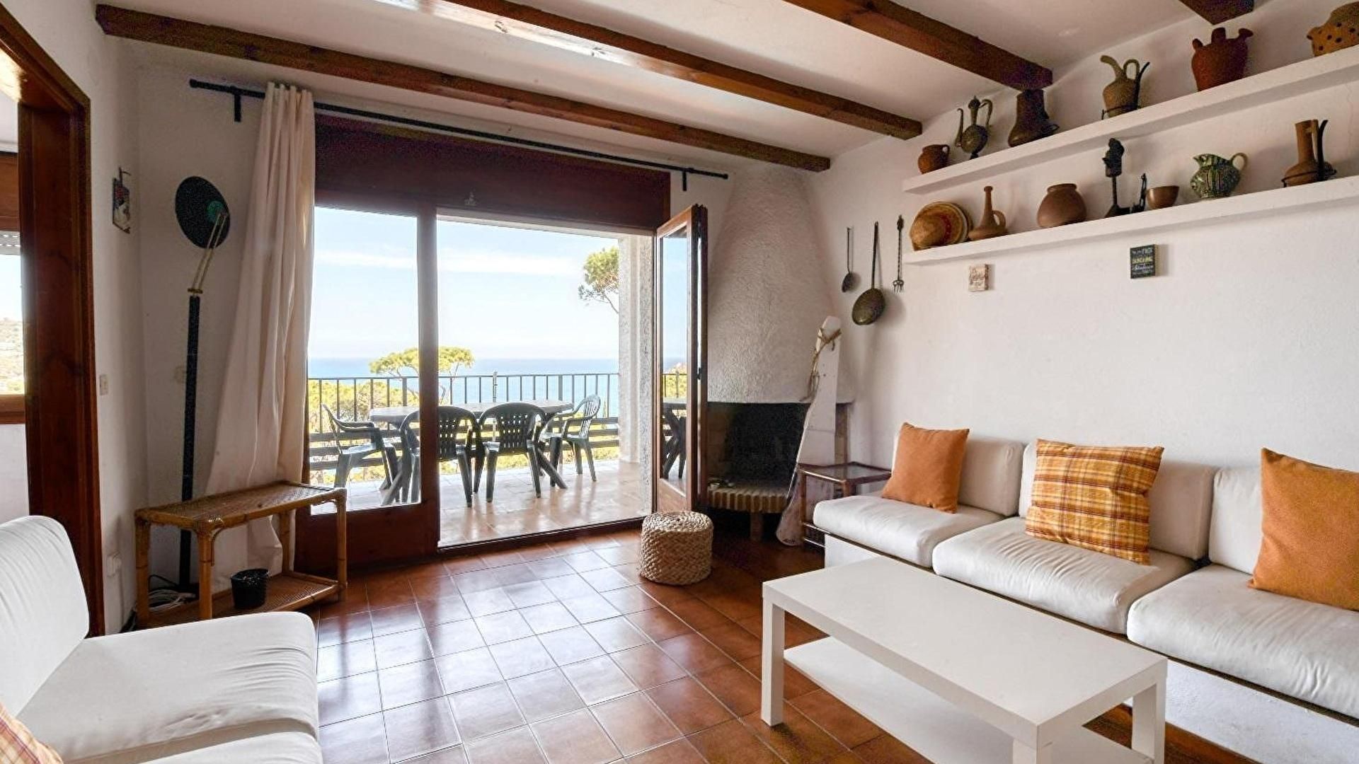 - Sala d'estar amb llar de foc, sortida a la terrassa i vistes al mar.