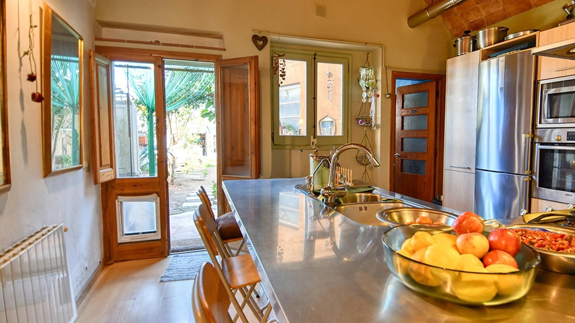 - Cuina oberta amb placa de cocció a gas i sortida al jardí privat.
