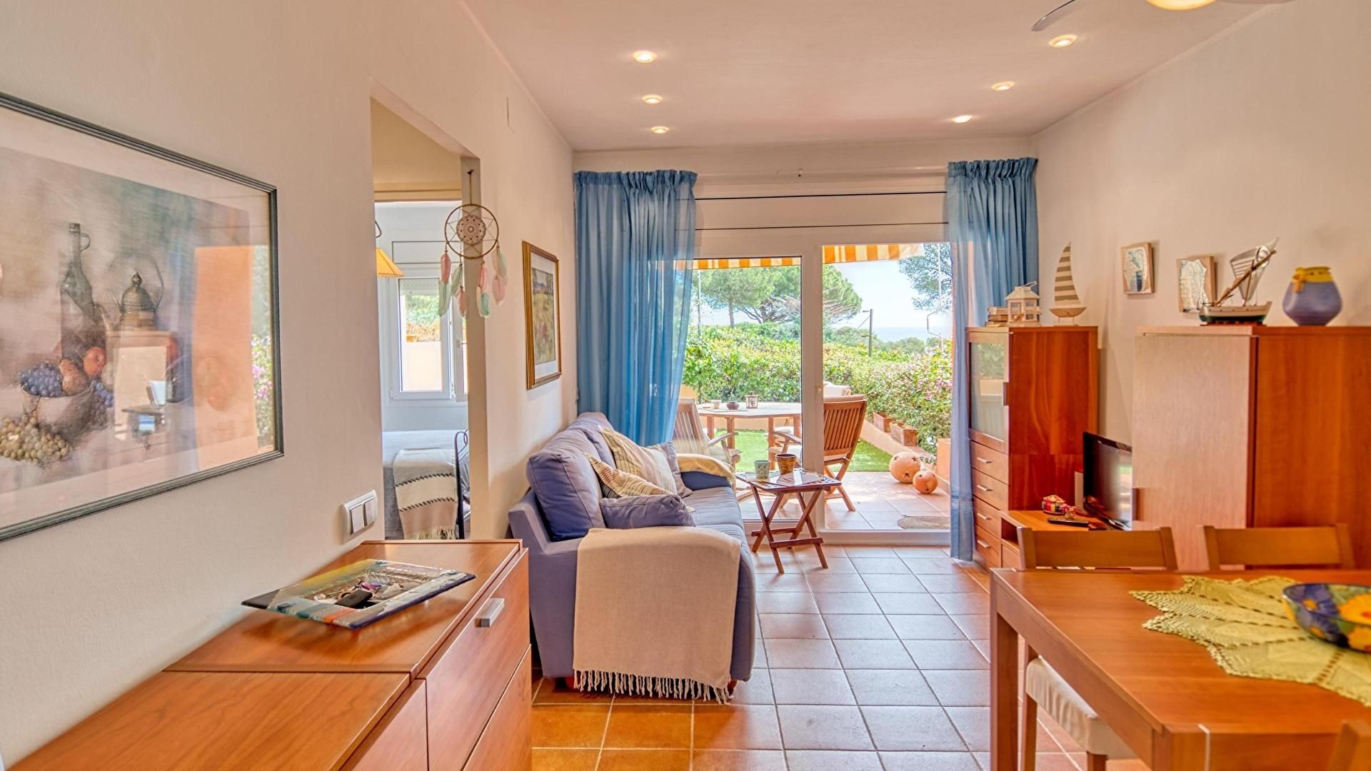 - Comedor-estar con ventilador en el techo, vistas al mar y salida a la terraza.