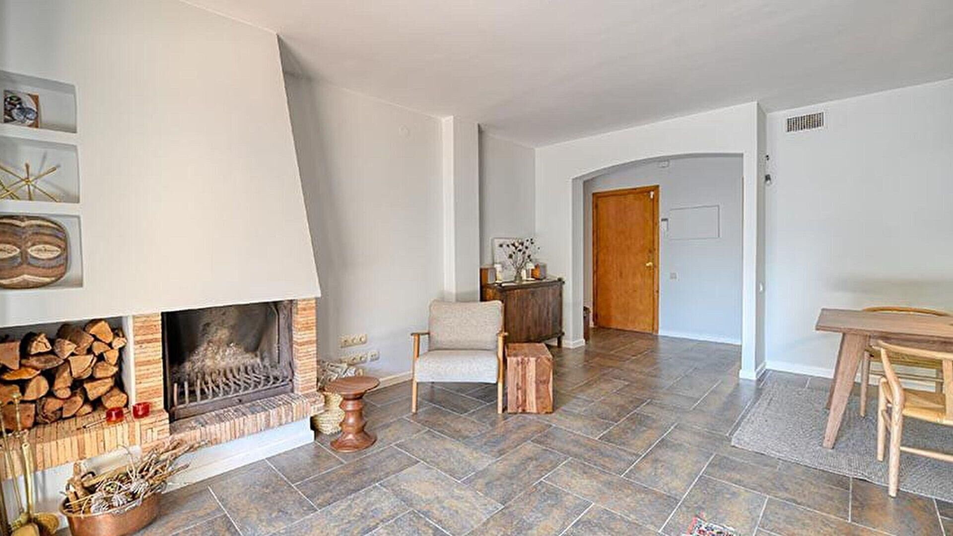 - Wohnzimmer mit ausgang zur terrasse, ausgang zum gemeinschatsgarten, meerblick und kamin.