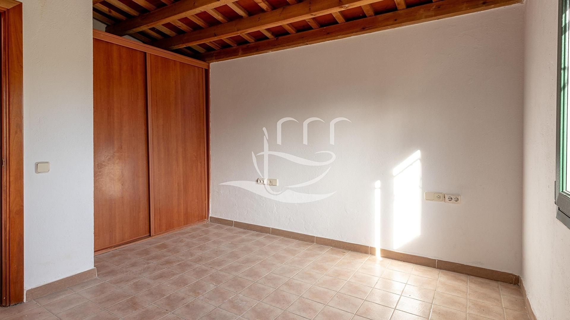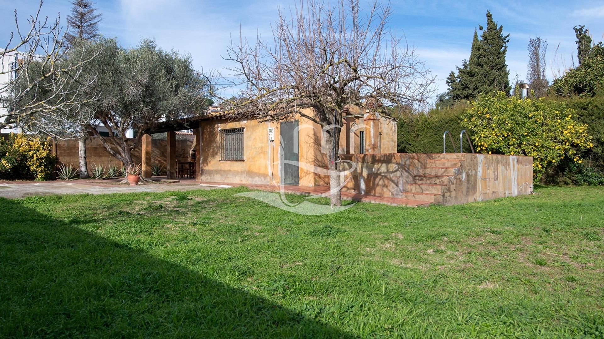 Garten mit Pool, Veranda, Wohnzimmer-Esszimmer, Küche-Office, Schlafzimmer und 1 Bad mit Dusche.