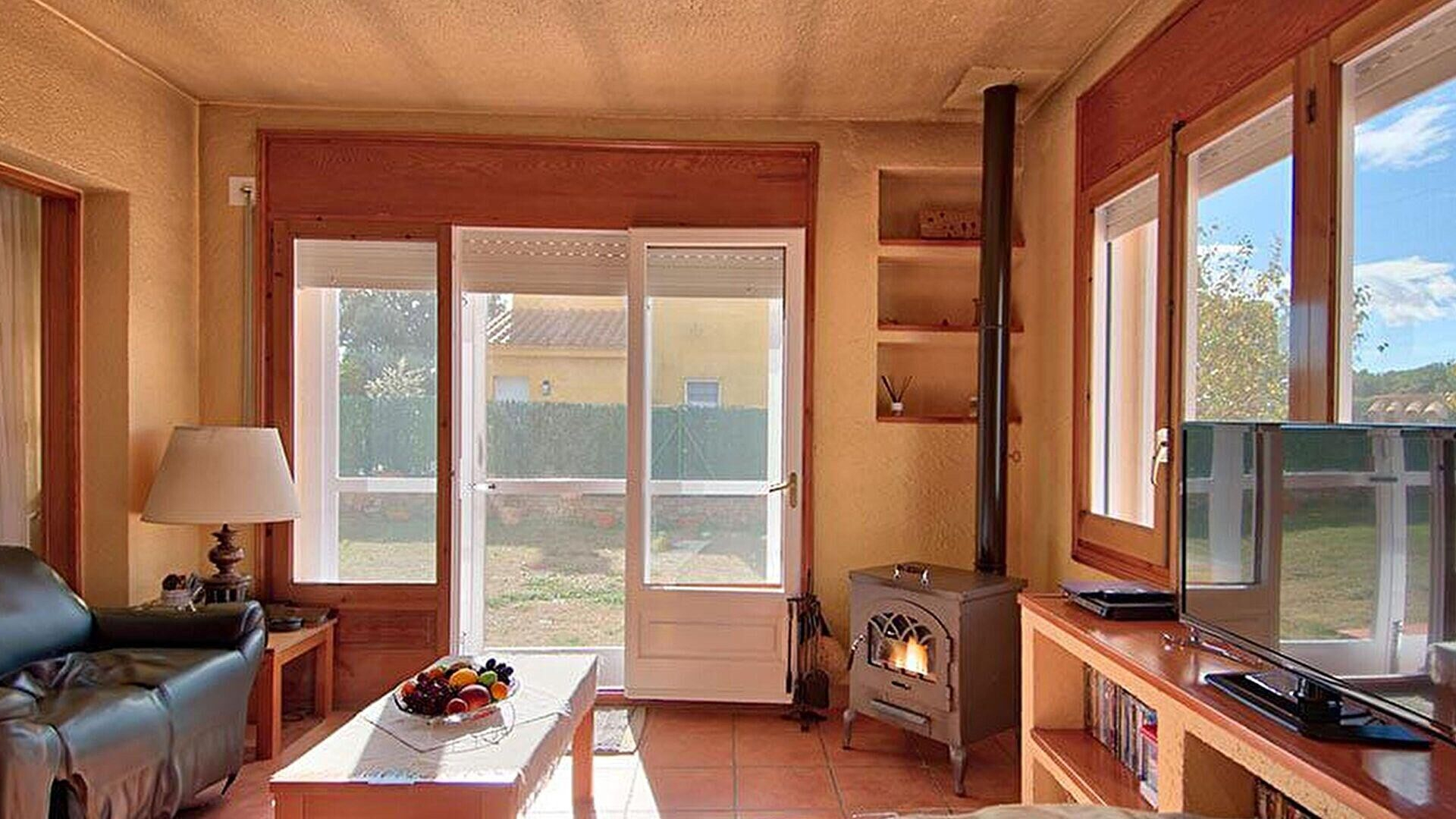 - Wohnzimmer-esszimmer mit kamin und ausgang zur terrasse.