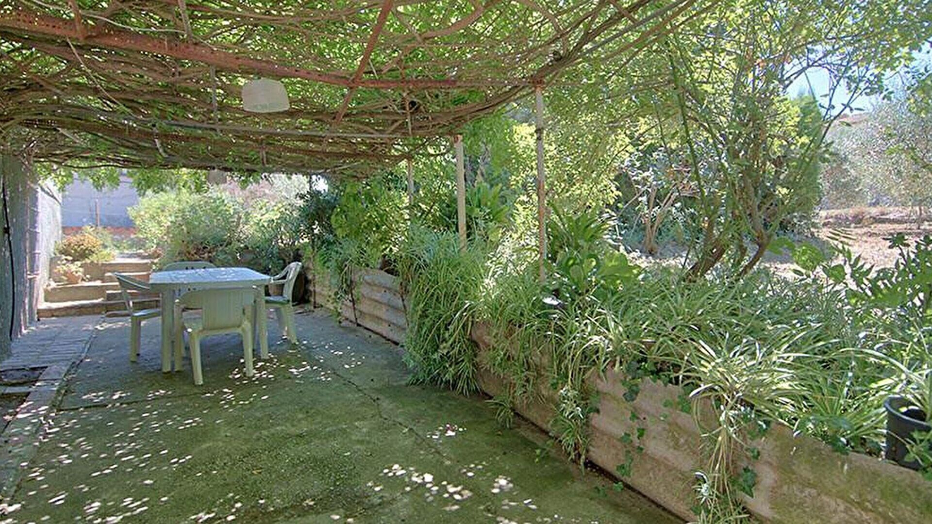 Garten, Terrasse, Esszimmer, Wohnzimmer, Küche-Office, 5 Schlafzimmer, 1 Bad mit Dusche und Abstellraum.