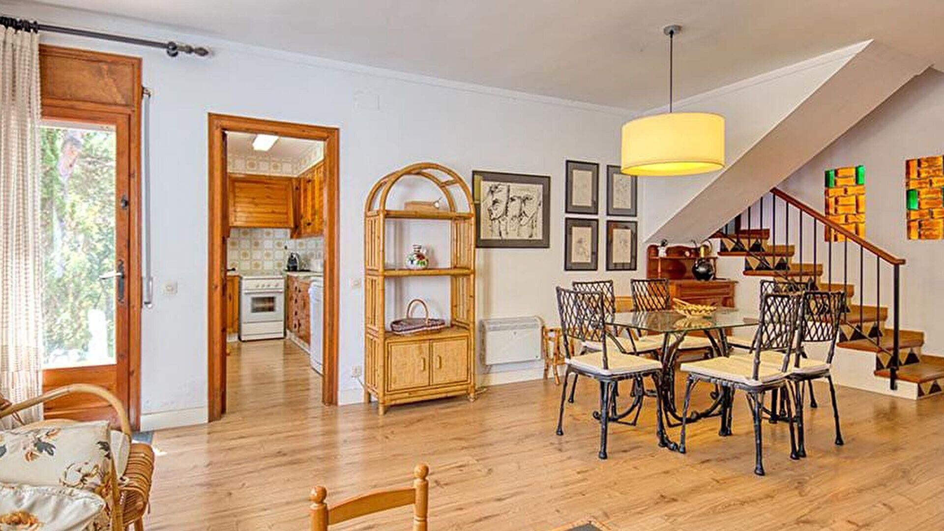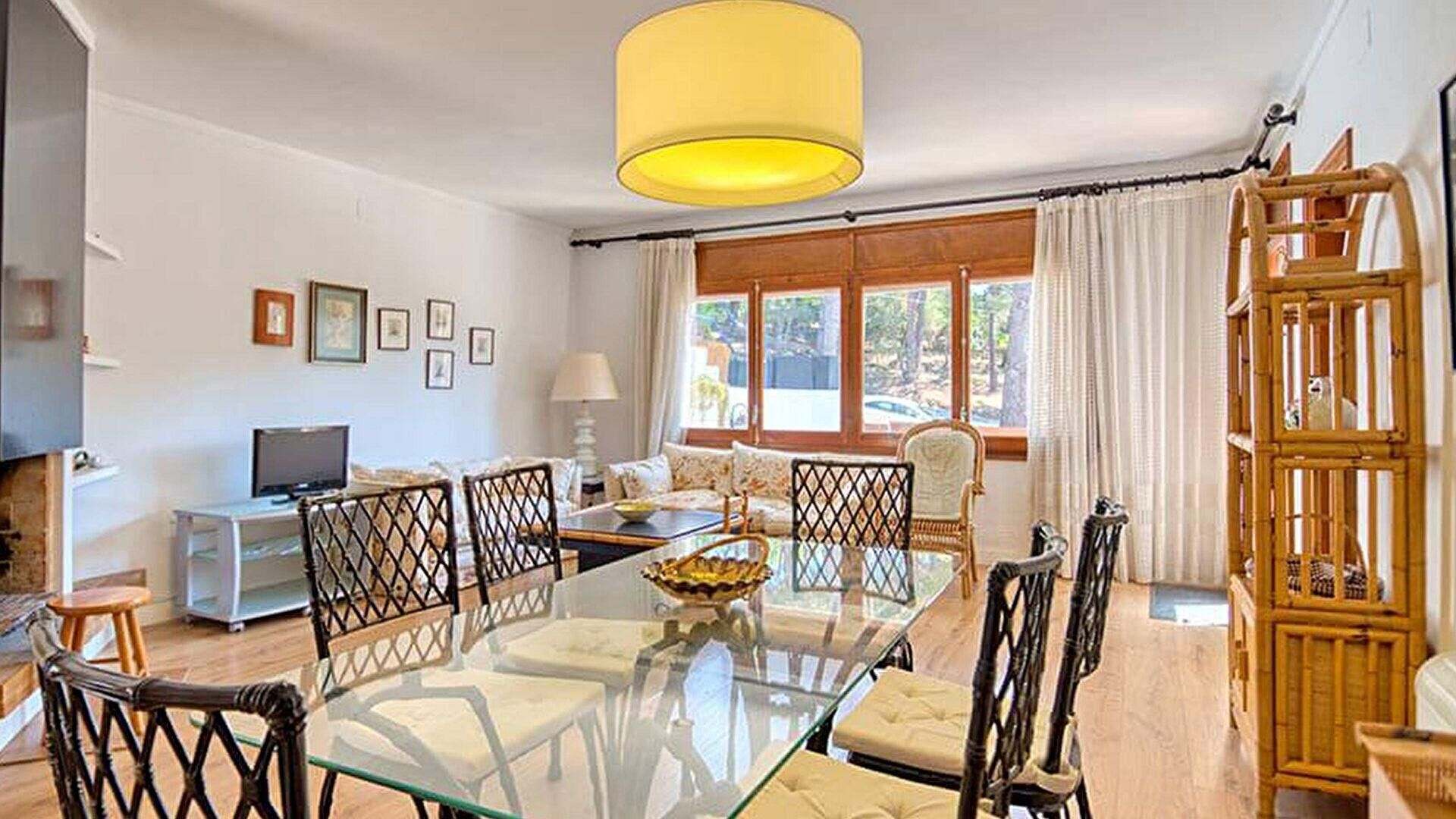Wohnzimmer-esszimmer mit kamin und ausgang zur terrasse.