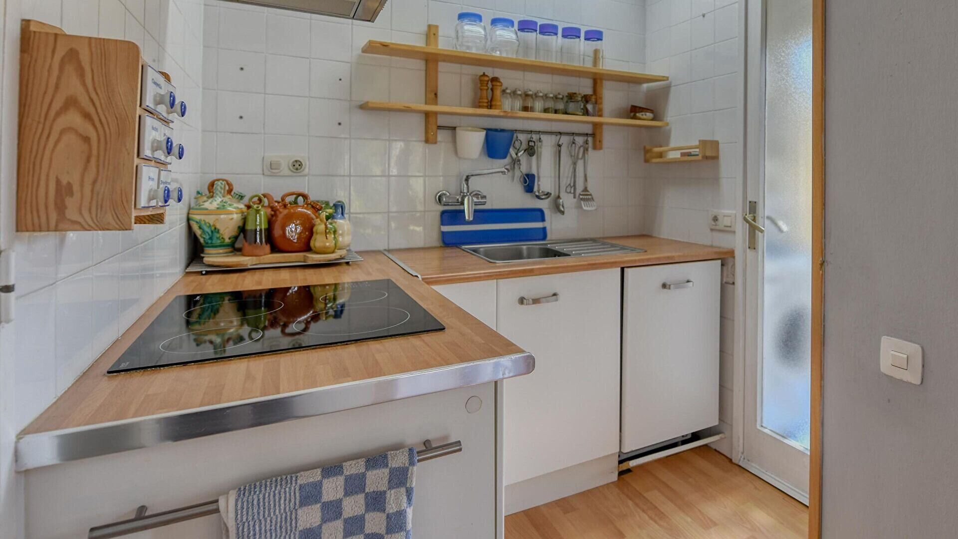 - Cuina oberta amb placa de cocció a gas, forn, nevera i rentadora.
