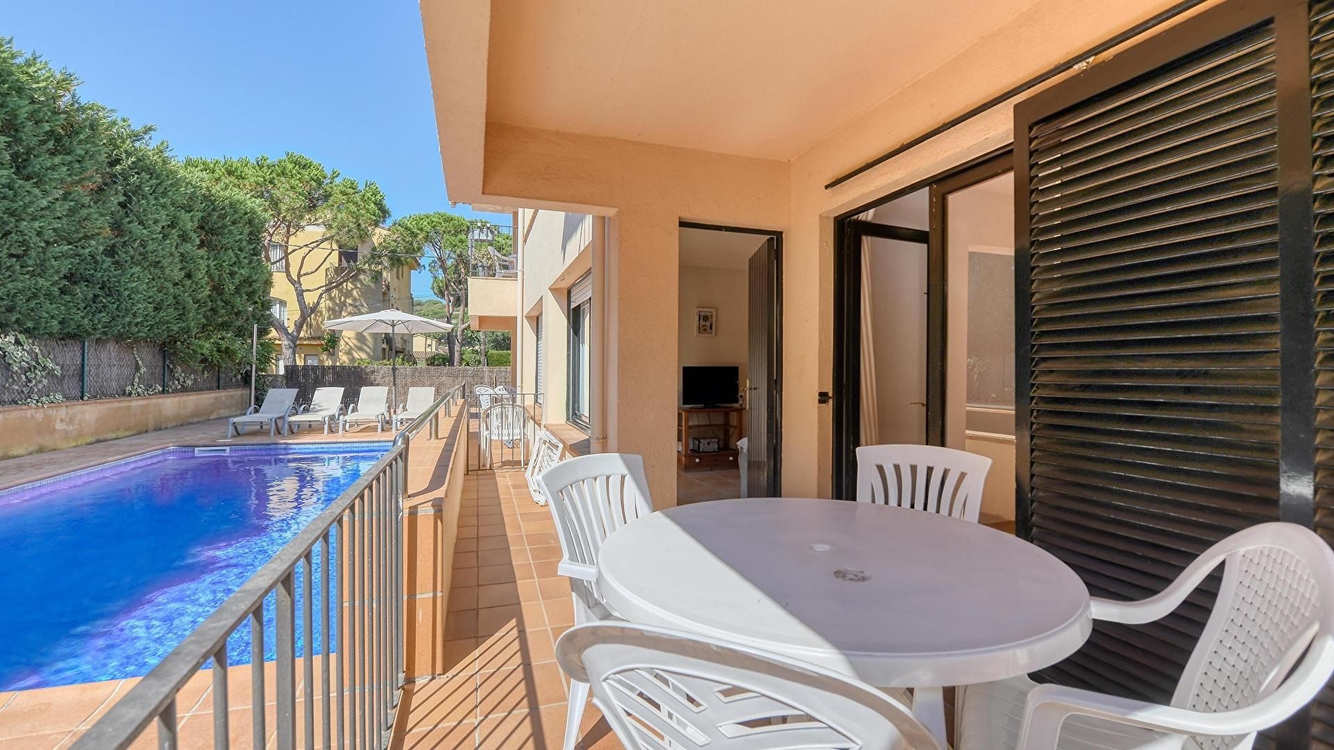 Piscina comunitària i mobles de terrassa.