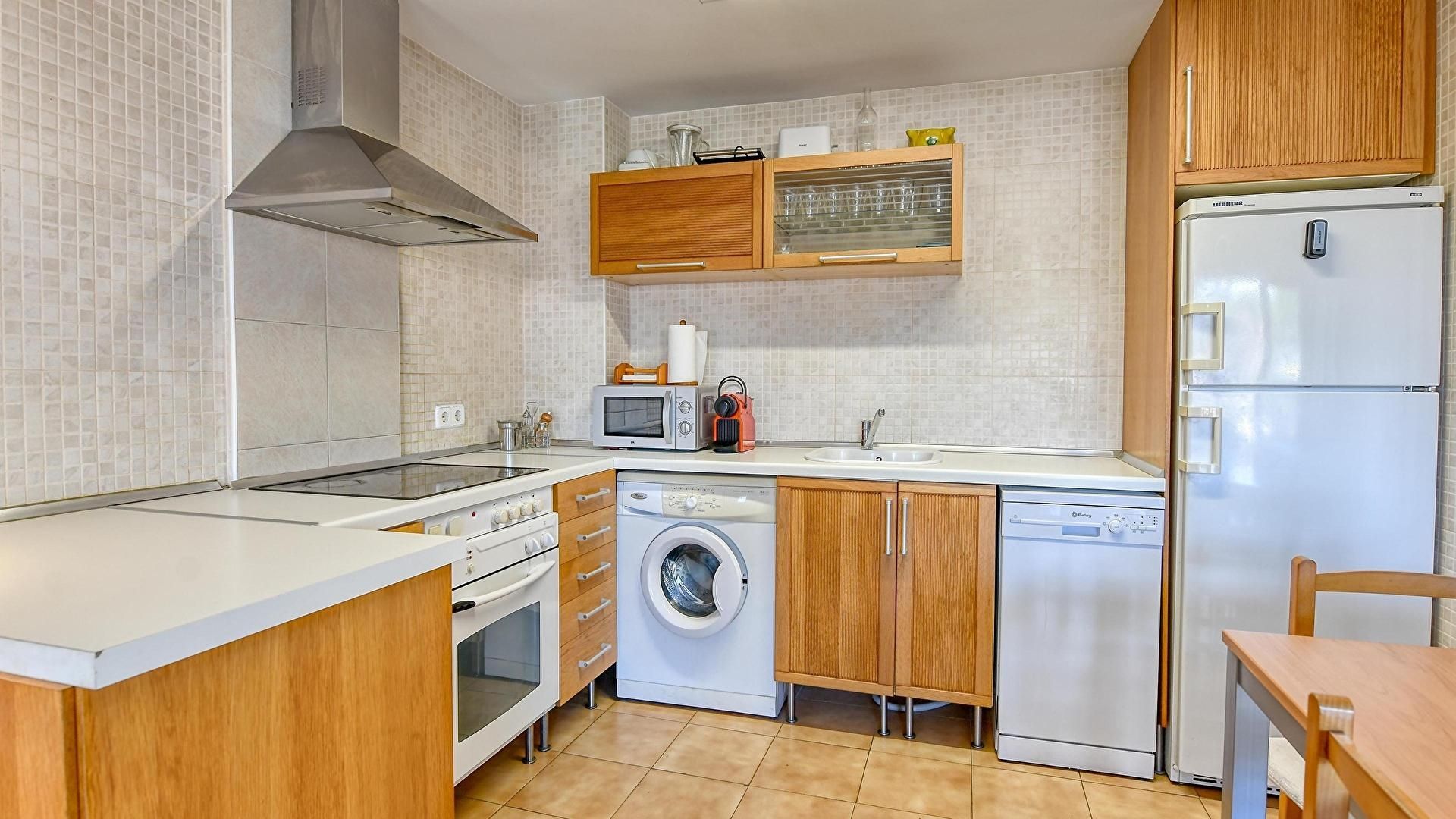 - Cuina oberta amb placa de cocció elèctrica, rentadora, rentaplats, forn i microones.