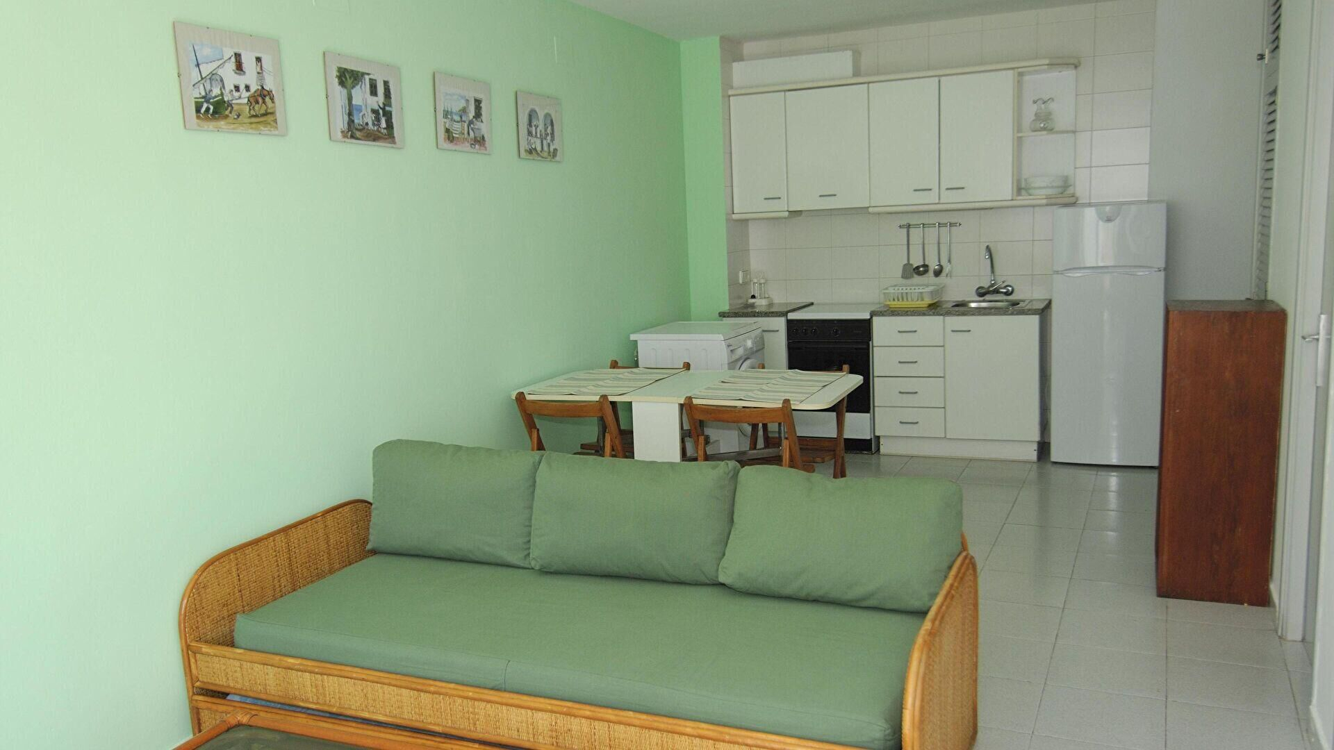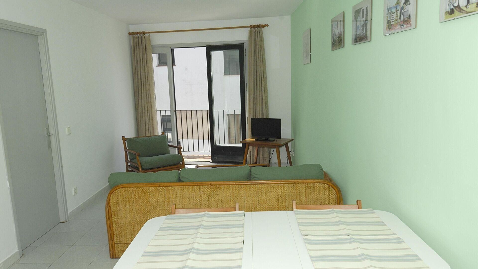 - Menjador-estar amb 1 sofà llit per a 2 persones, televisor i sortida al balcó.