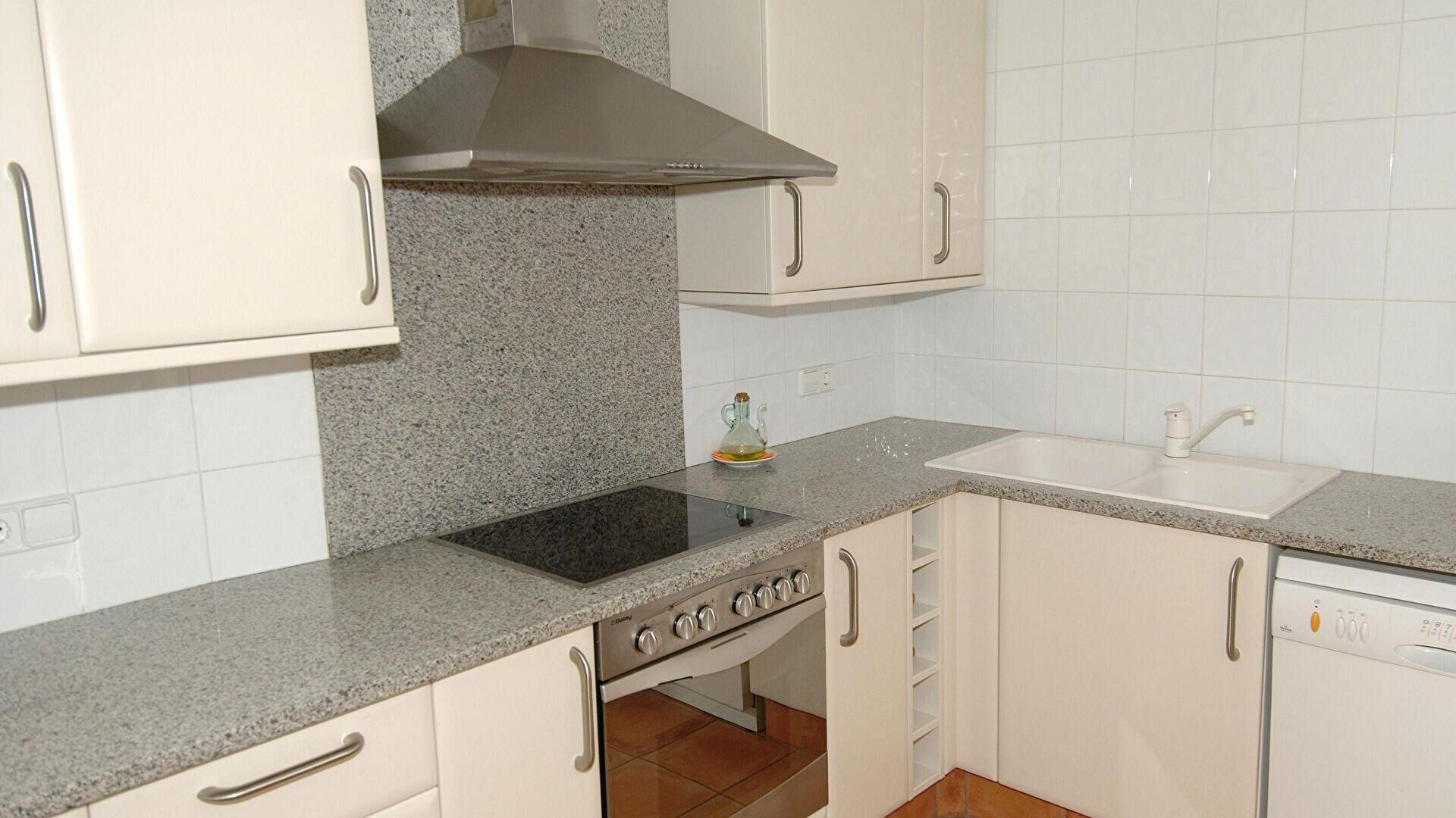 - Cuina oberta amb placa de cocció vitroceràmica, forn, microones, nevera, rentaplats, secadora i rentadora.