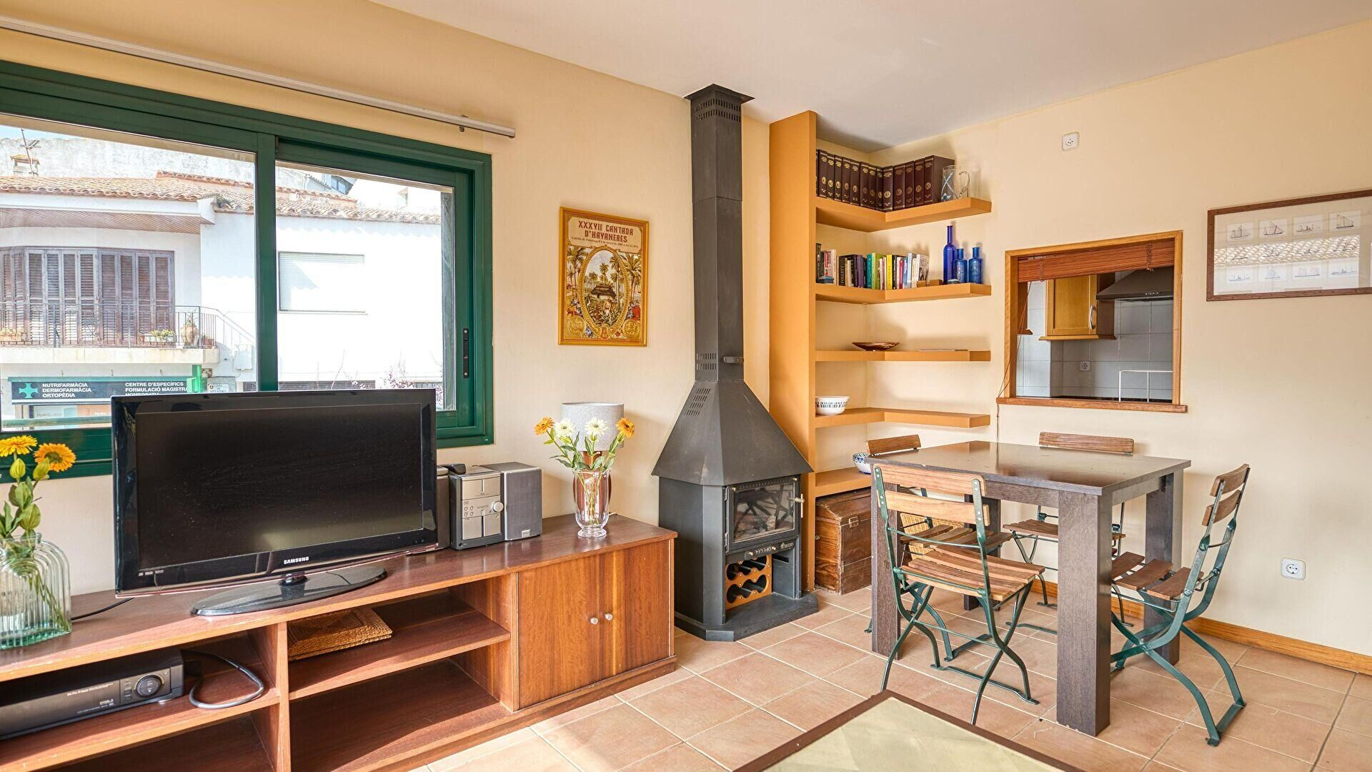 - Menjador-estar, llar de foc, televisor i sortida a la terrassa.