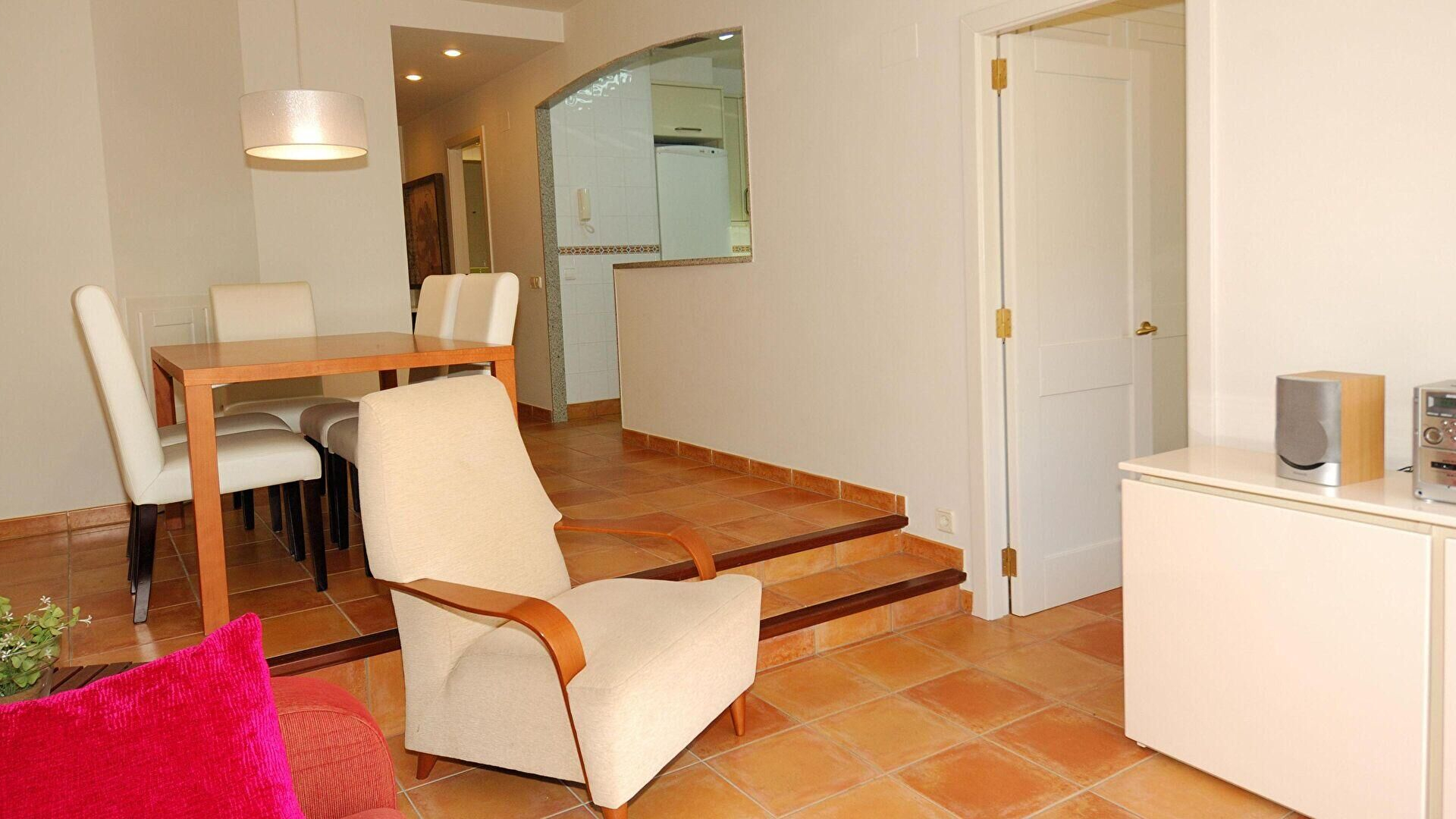 - Menjador-estar, televisor i sortida a la terrassa.