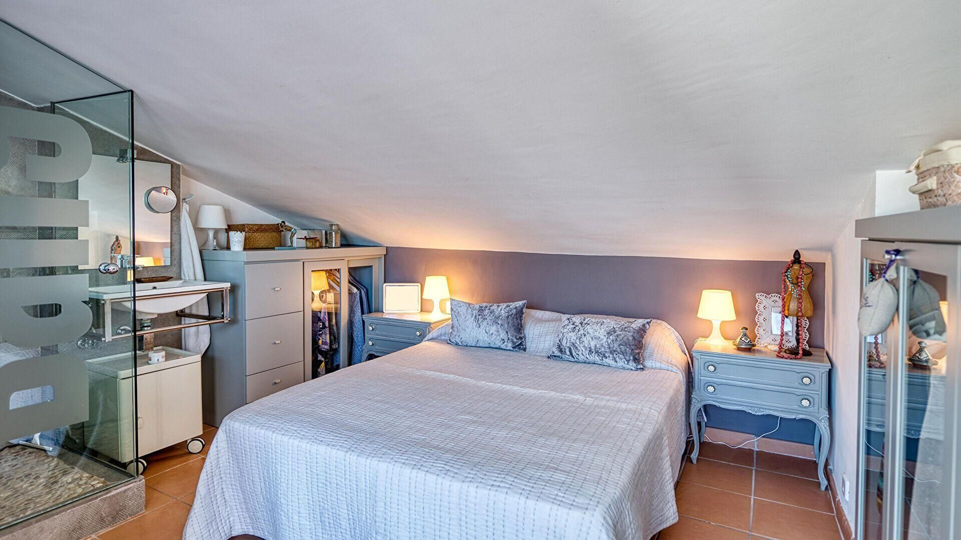 Planta 1- Dormitori amb 1 llit de matrimoni, sortida a la terrassa-solàrium i dutxa (en suite).
