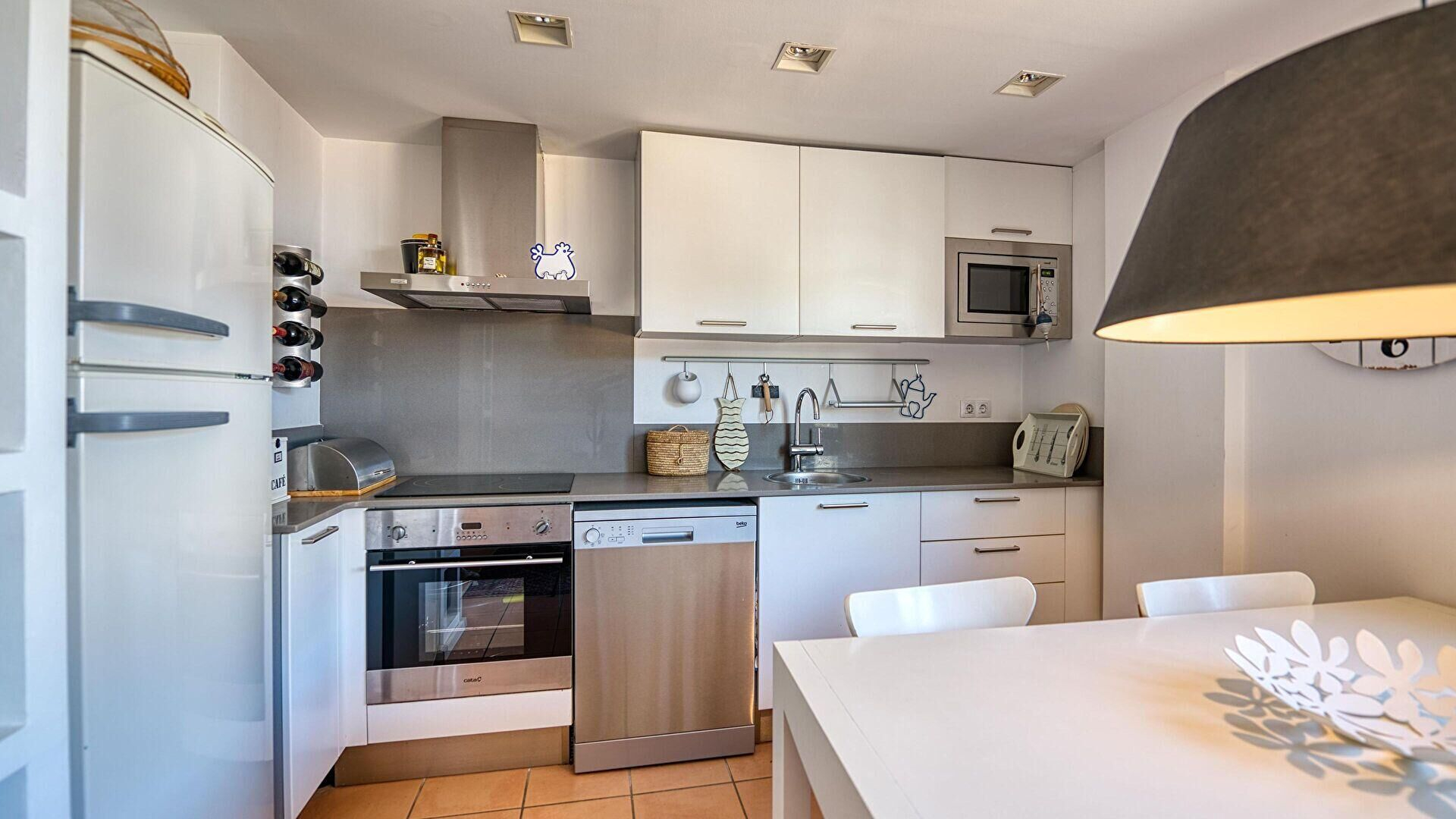 Planta 0- Cuina oberta amb placa de cocció vitroceràmica, forn, rentaplats i combi.