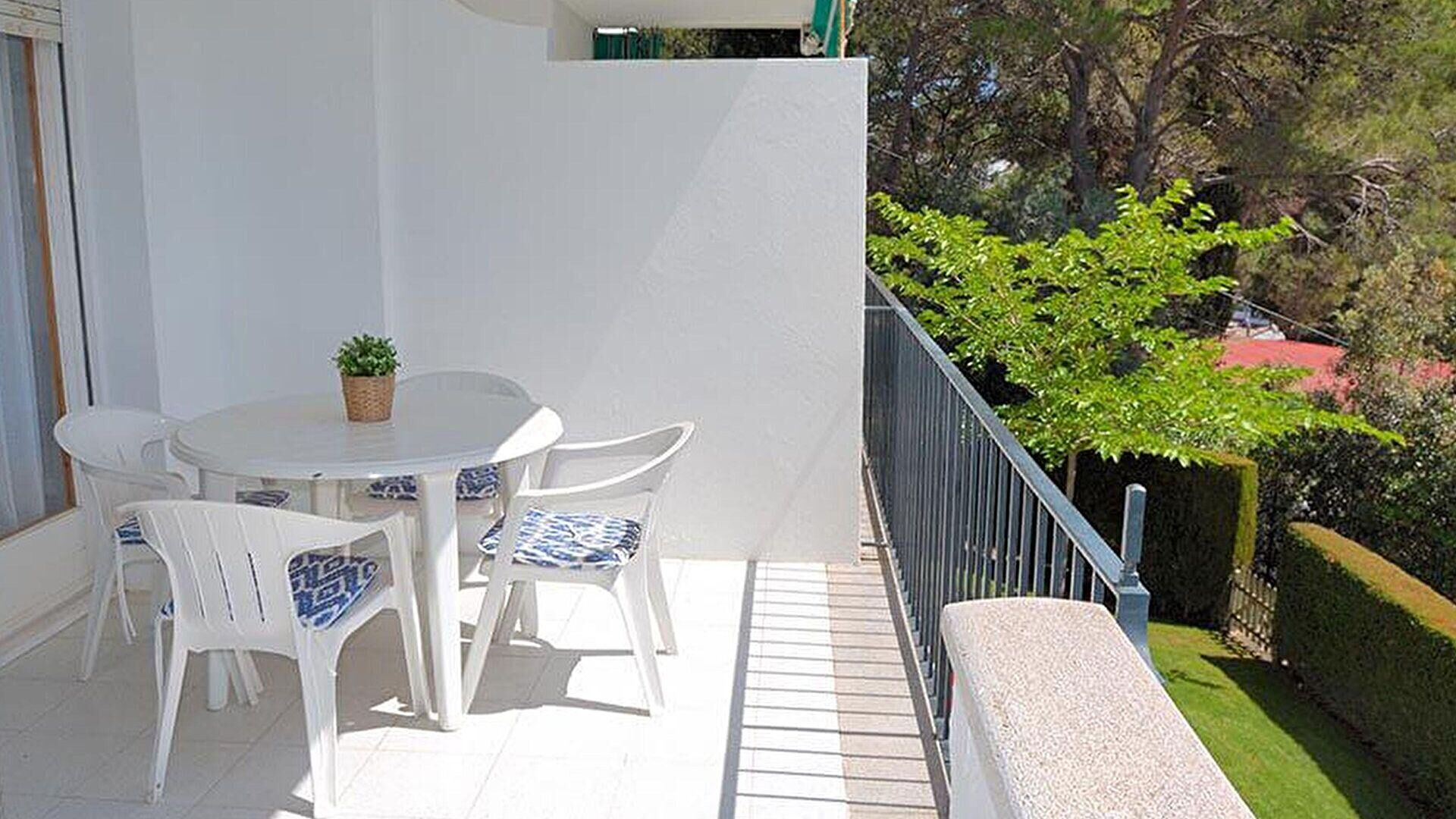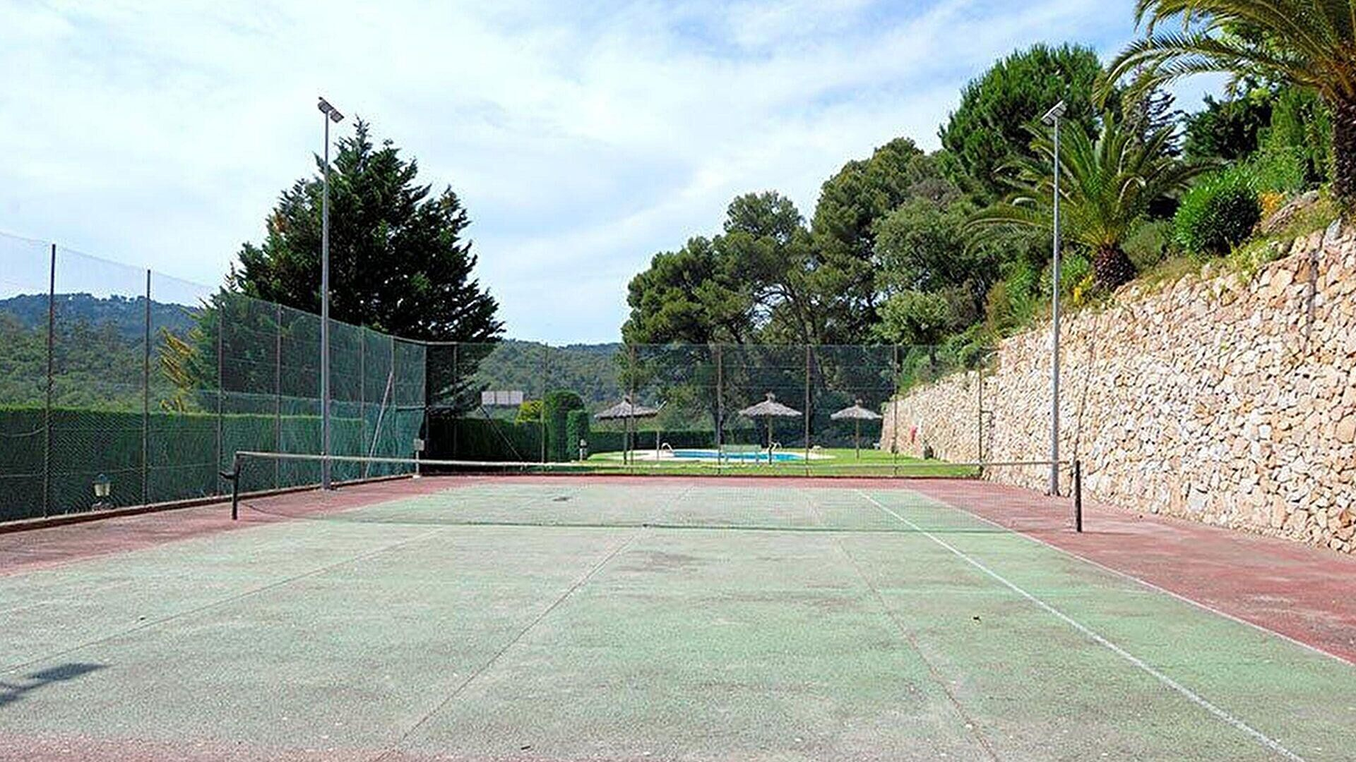Jardà comunitari, piscina comunità ria, mobles de terrassa i pista de tennis.