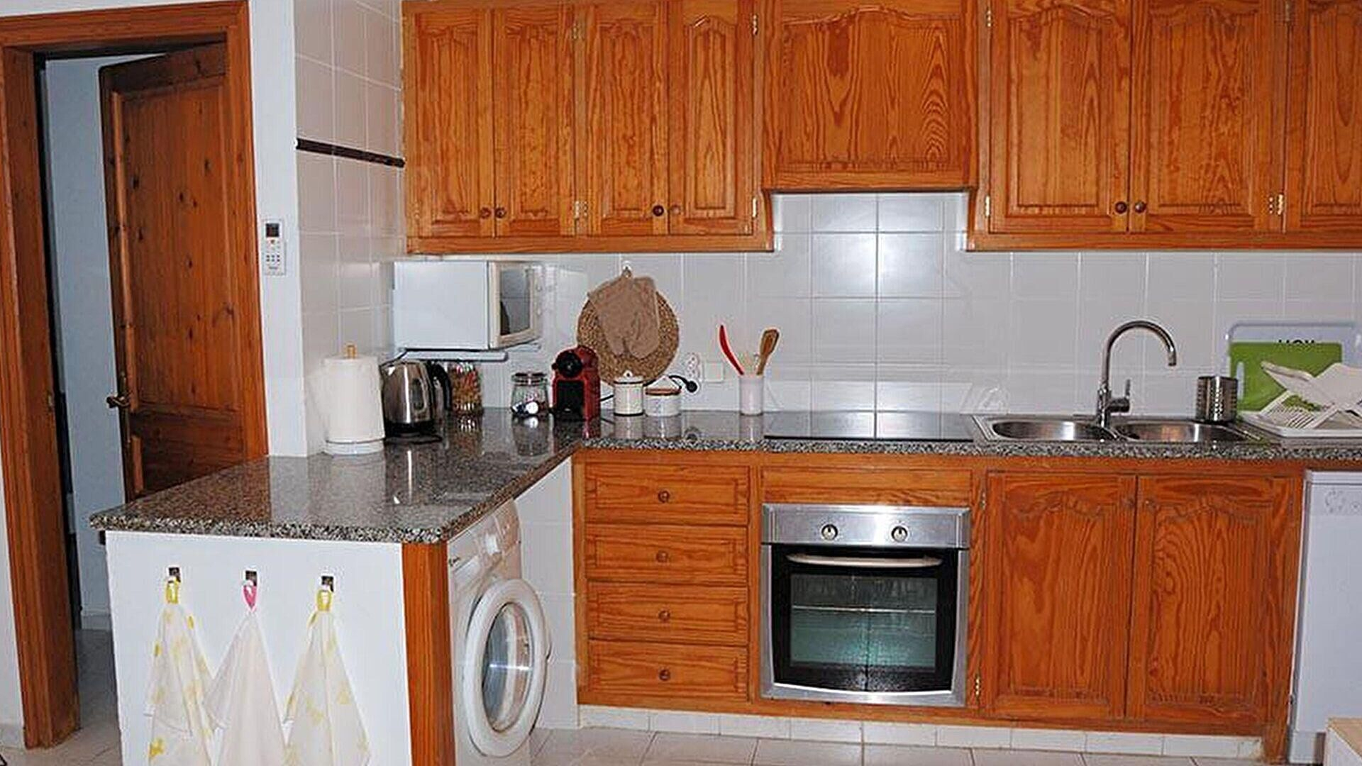 - Cuina oberta amb forn, microones, combi, rentaplats, rentadora i placa de cocció vitrocerà mica.