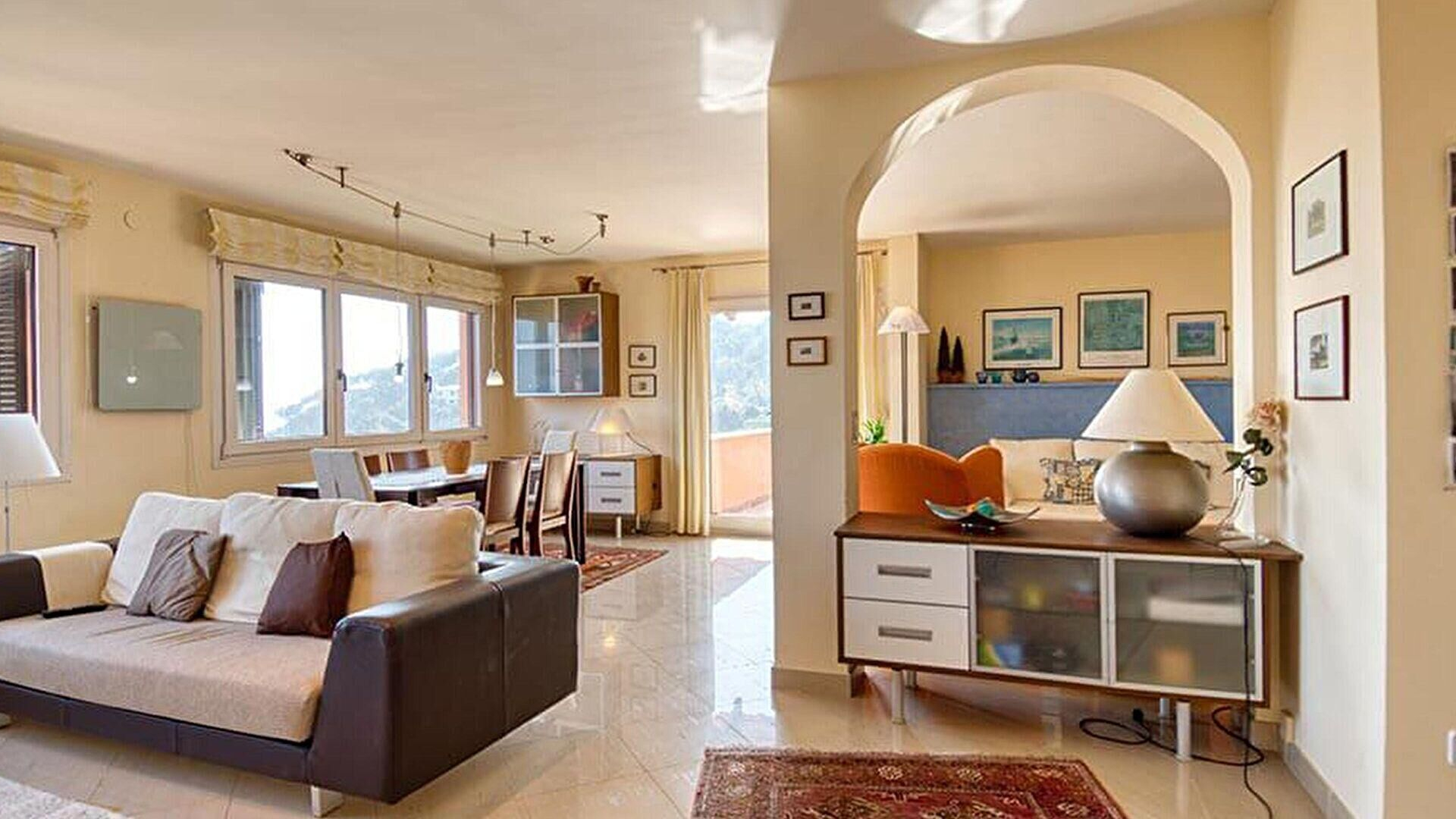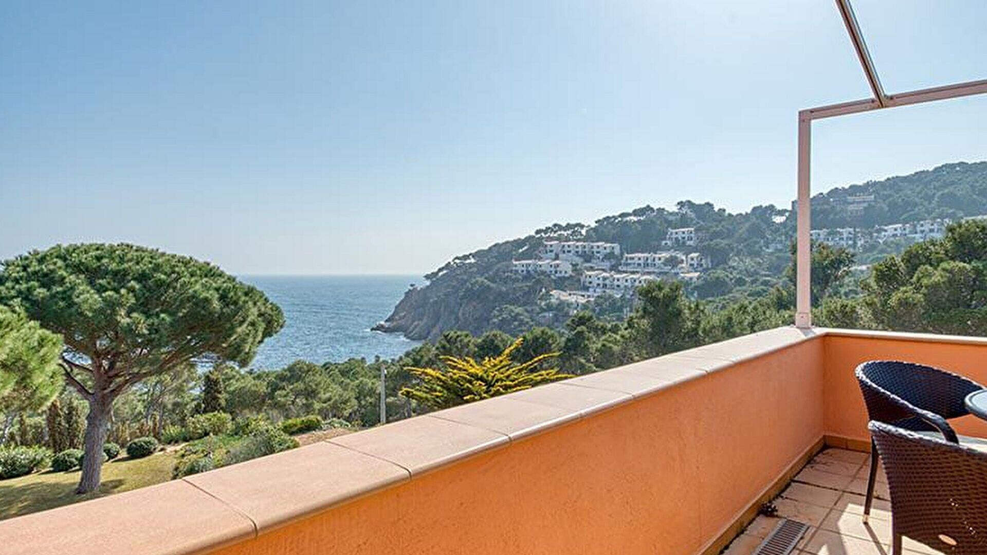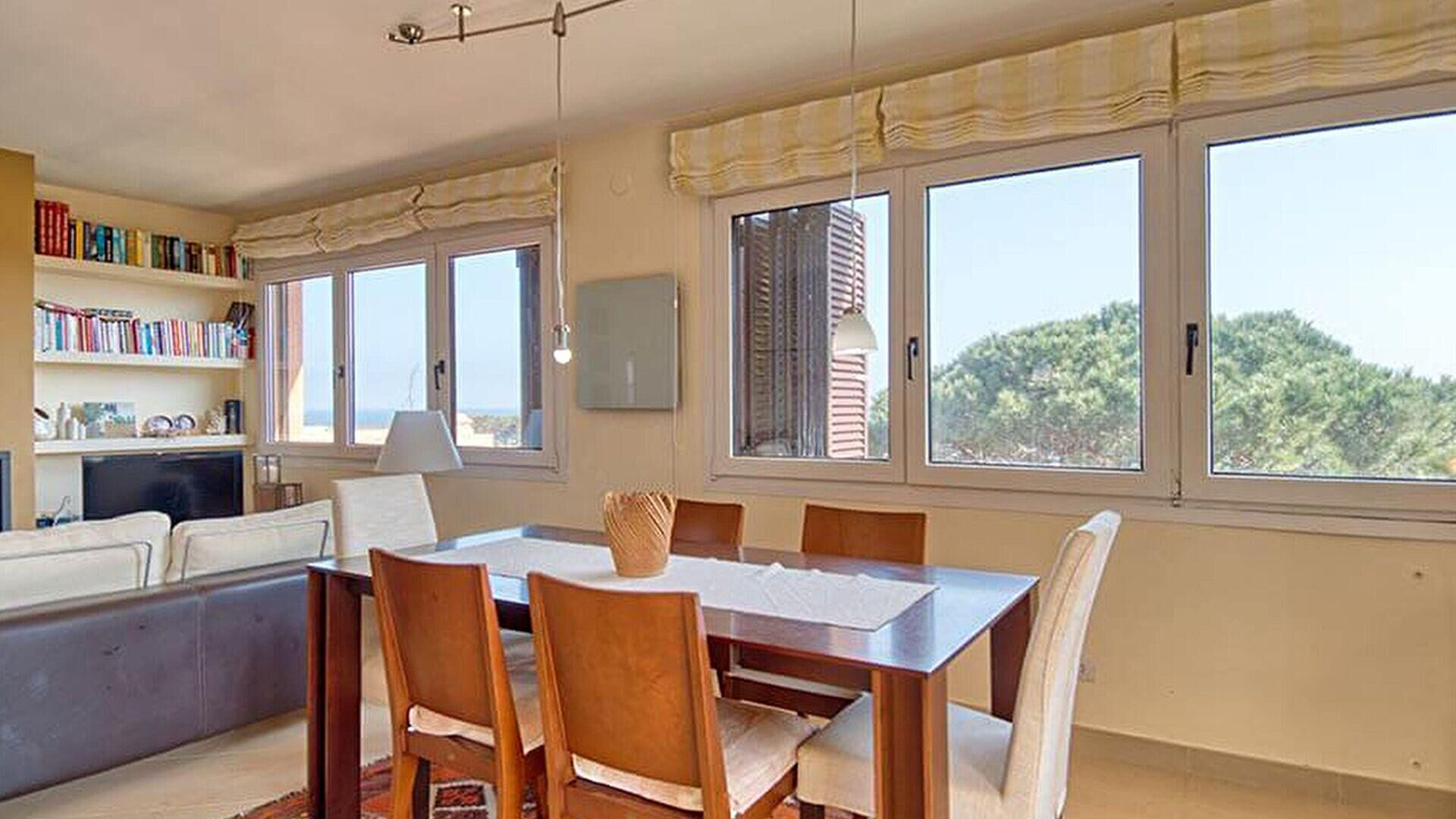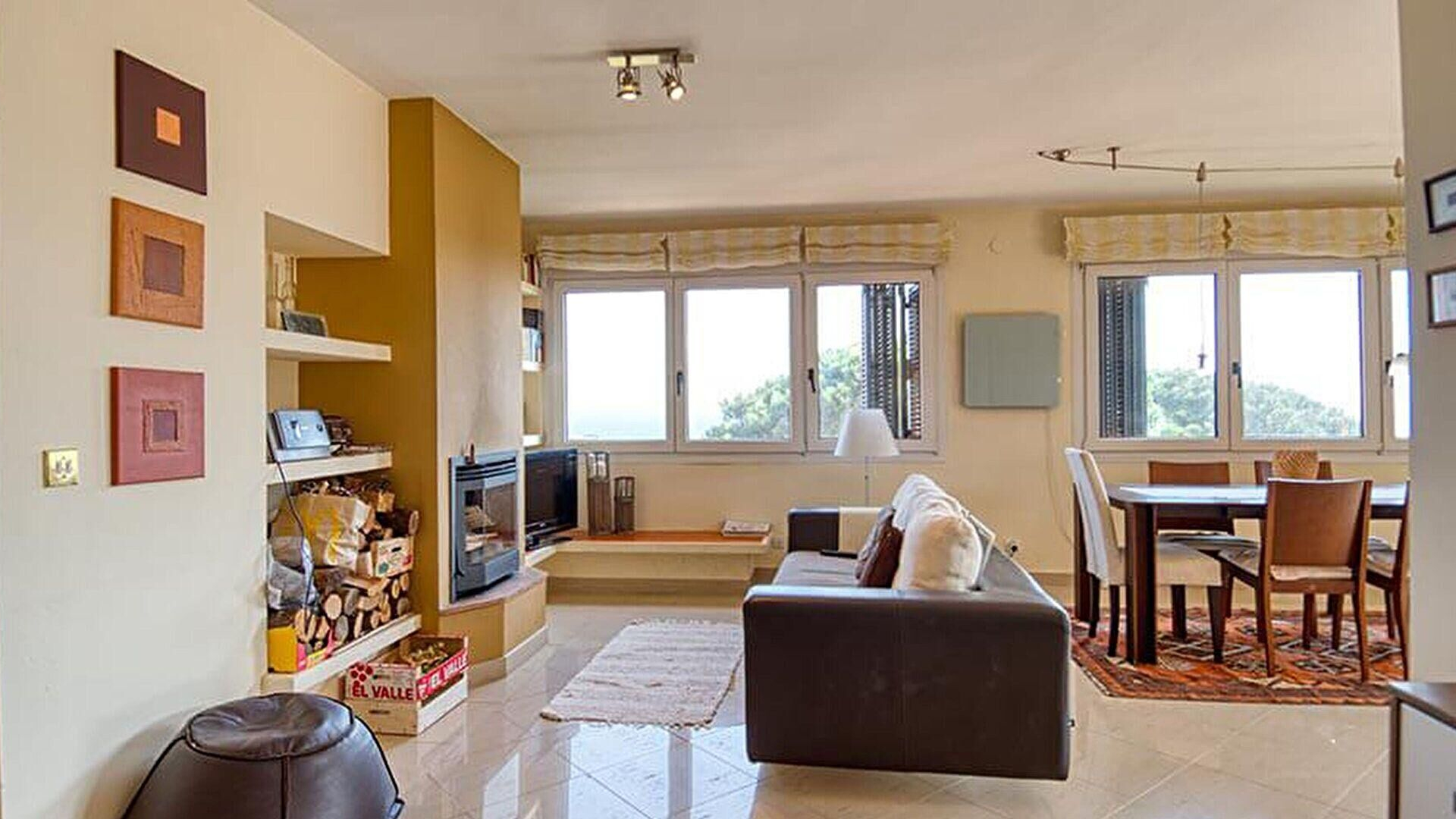 - Menjador-estar amb televisor, llar de foc, sortida a la terrassa i vistes al mar.