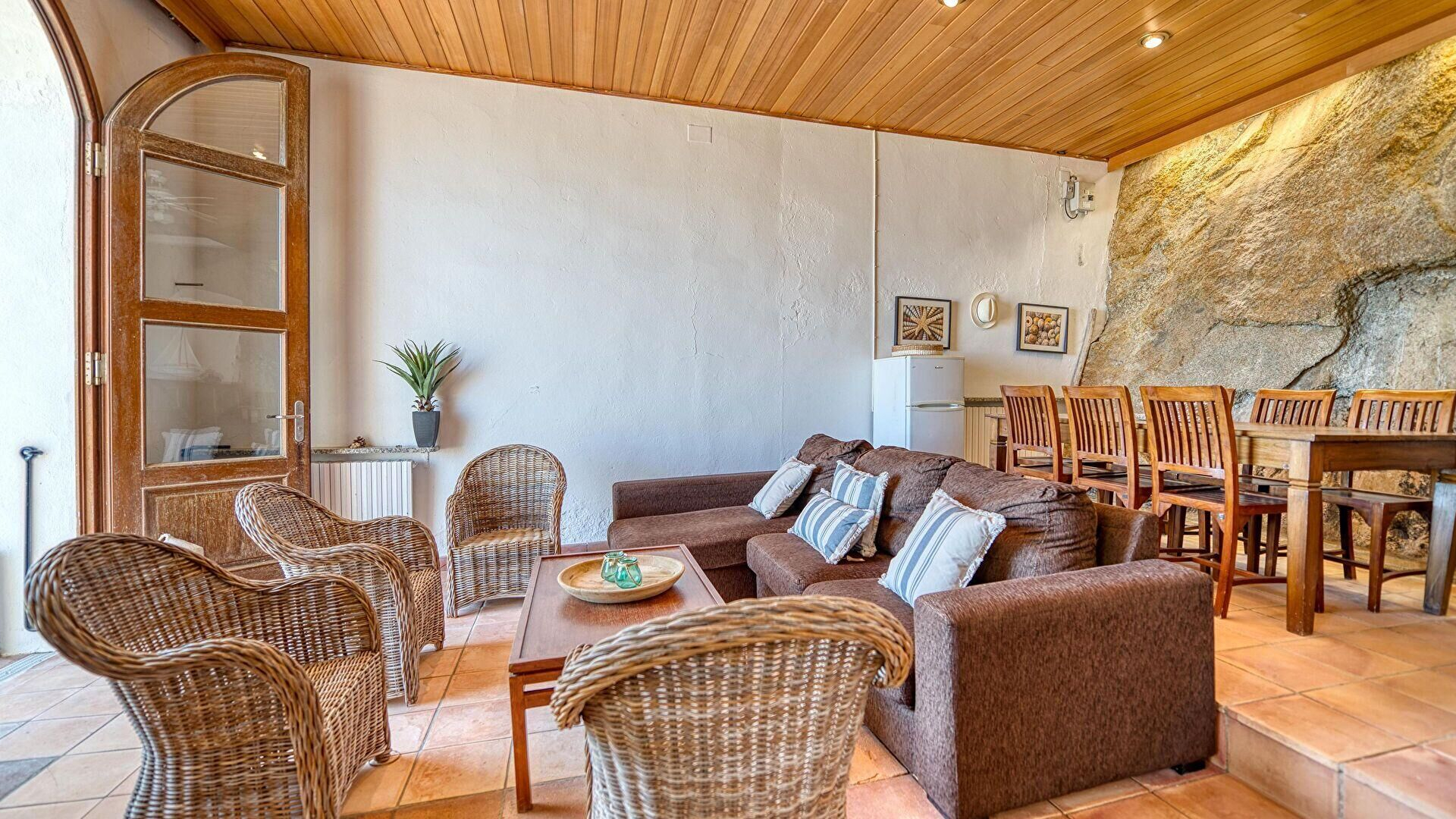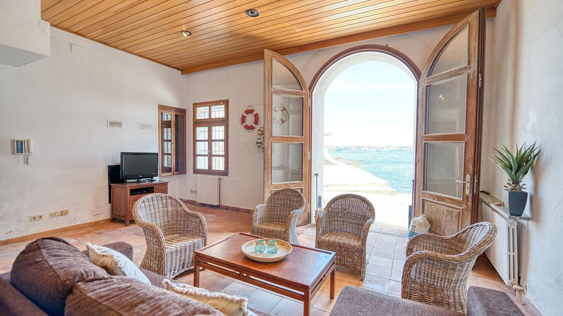 Planta baixa- Menjador-estar, vistes al mar, televisor, ventilador en el sostre i sortida al mar.