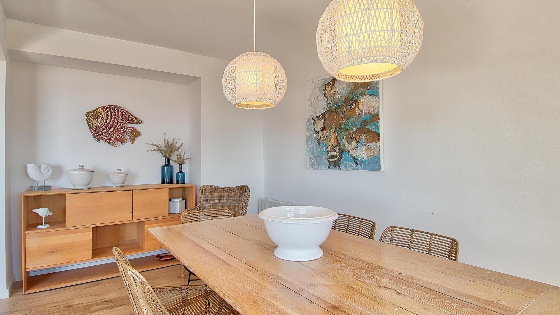- Menjador, televisor, sortida a la terrassa, vistes al mar i aire condicionat fred i calent.