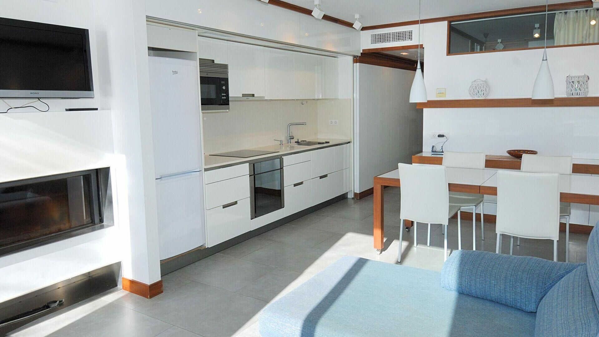 • Cuina oberta amb placa de cocció vitroceràmica, forn, microones, combi, rentaplats, secadora i rentadora.