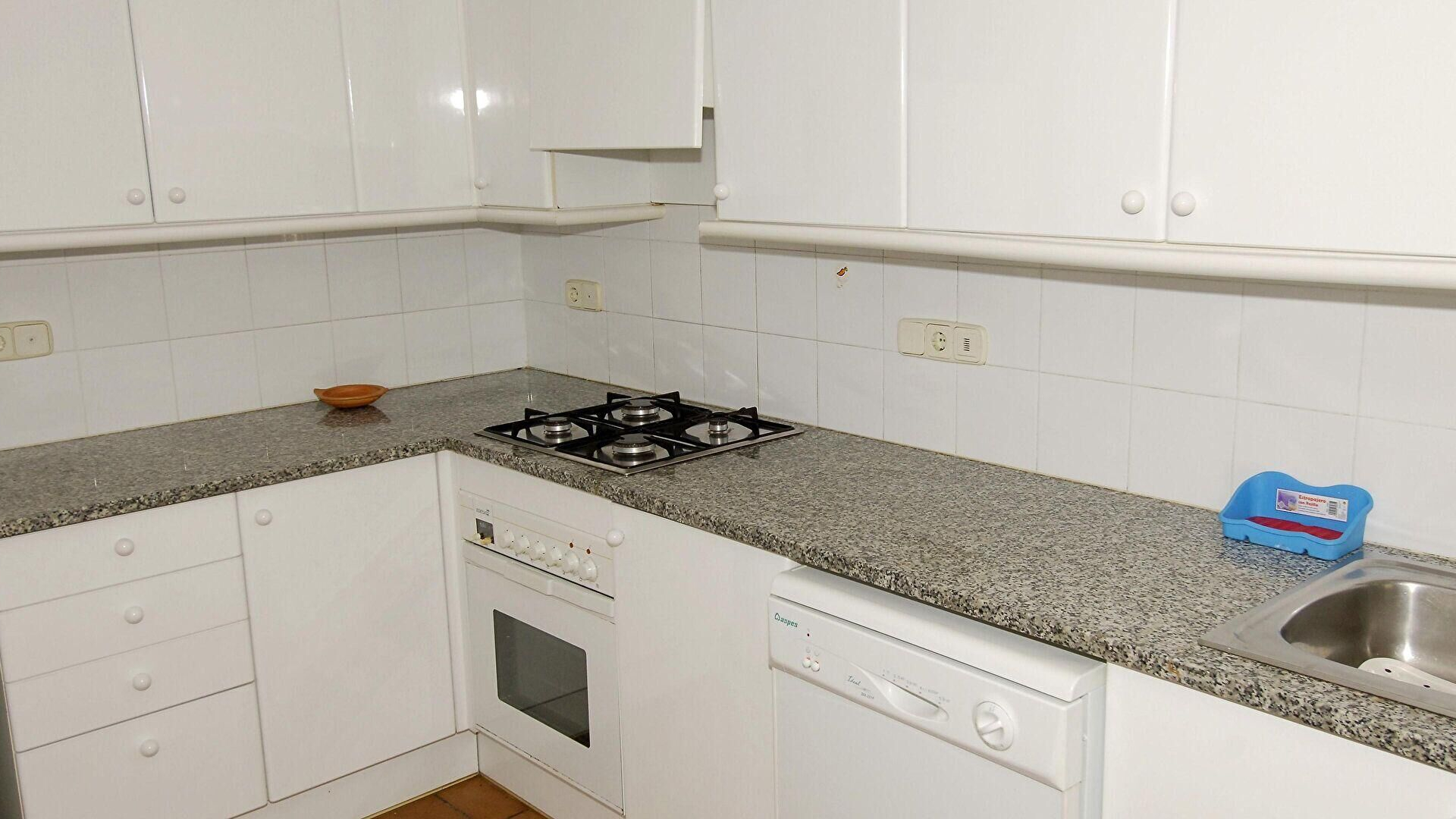 • Cuina oberta amb placa de cocció a gas, forn, nevera, rentaplats i rentadora.