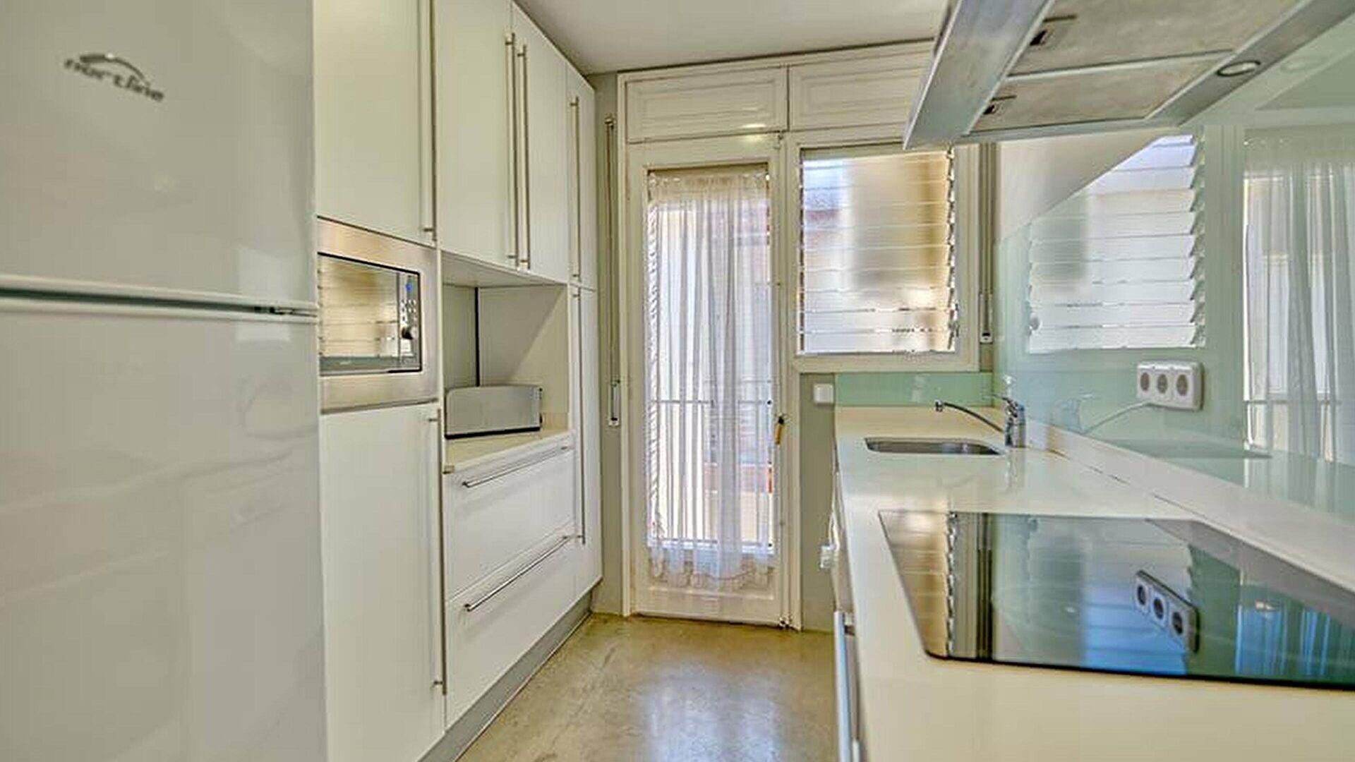 • Cuina oberta amb placa de cocció vitroceràmica, forn, microones, nevera, rentaplats i rentadora.