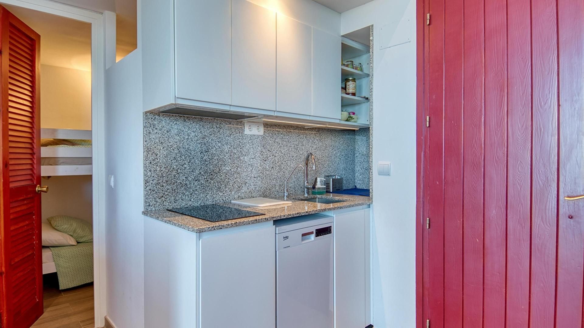 - Cuina oberta amb placa de cocció vitrocerà mica, microones, rentaplats, combi, vistes al mar i sortida al jardà privat.