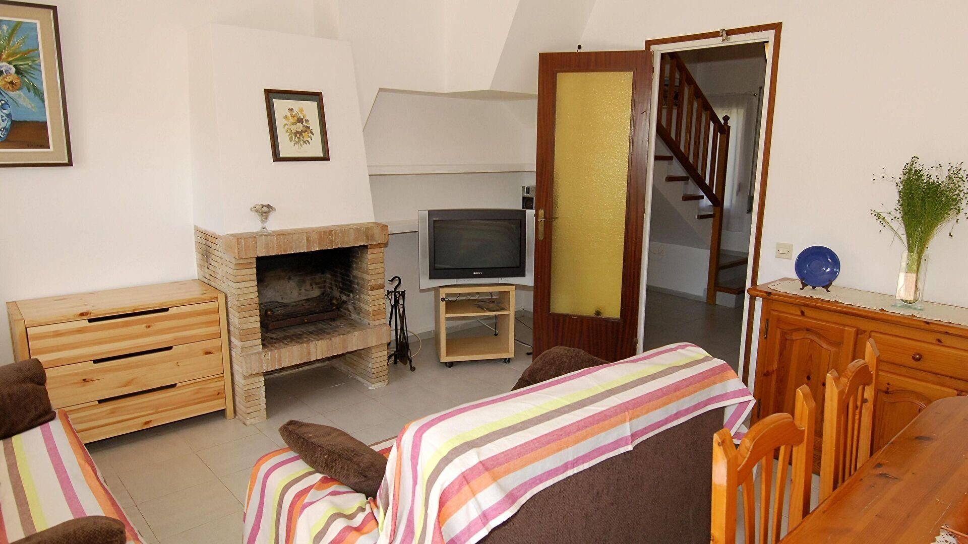 - Salle de séjour, cheminée, téléviseur et sortie sur la terrasse.