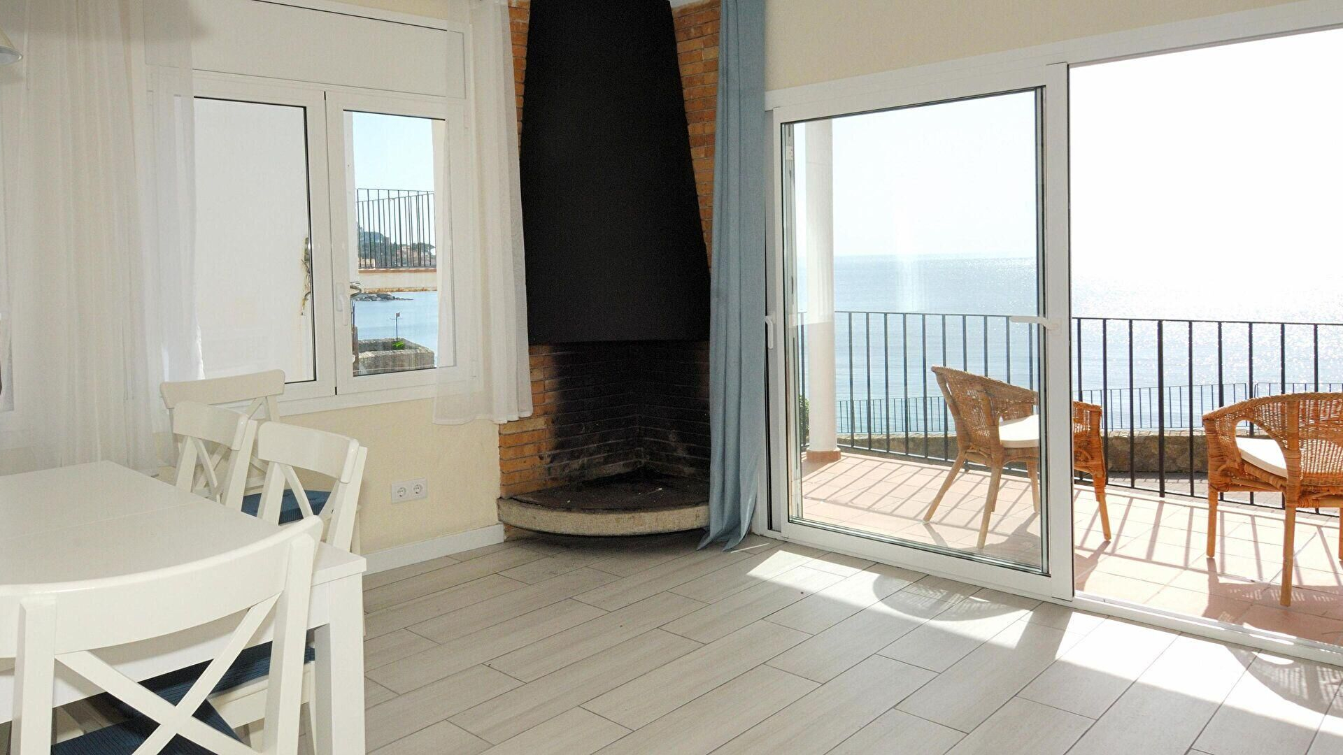 Rez-de-chaussée- Salle de séjour, cheminée, air conditionnée froid/chaud, vue sur la mer et sortie sur la terrasse.