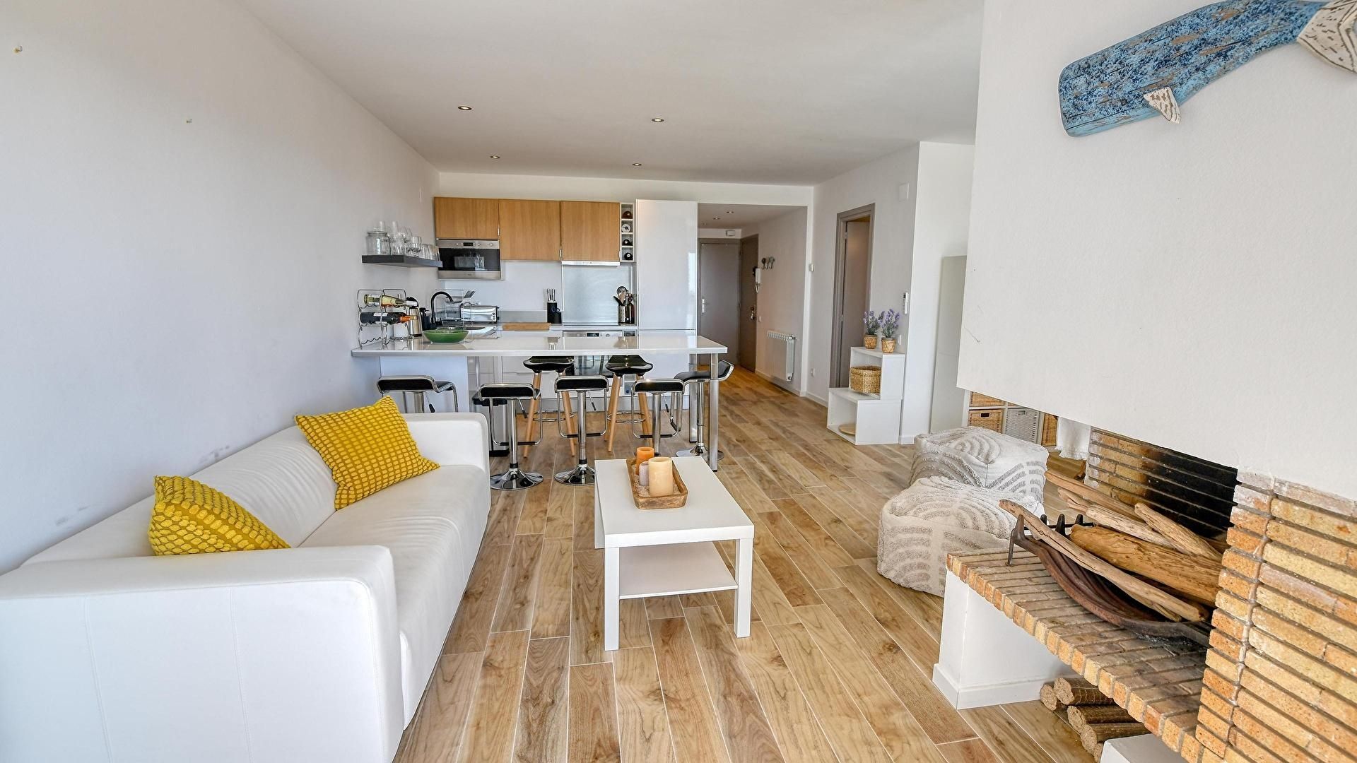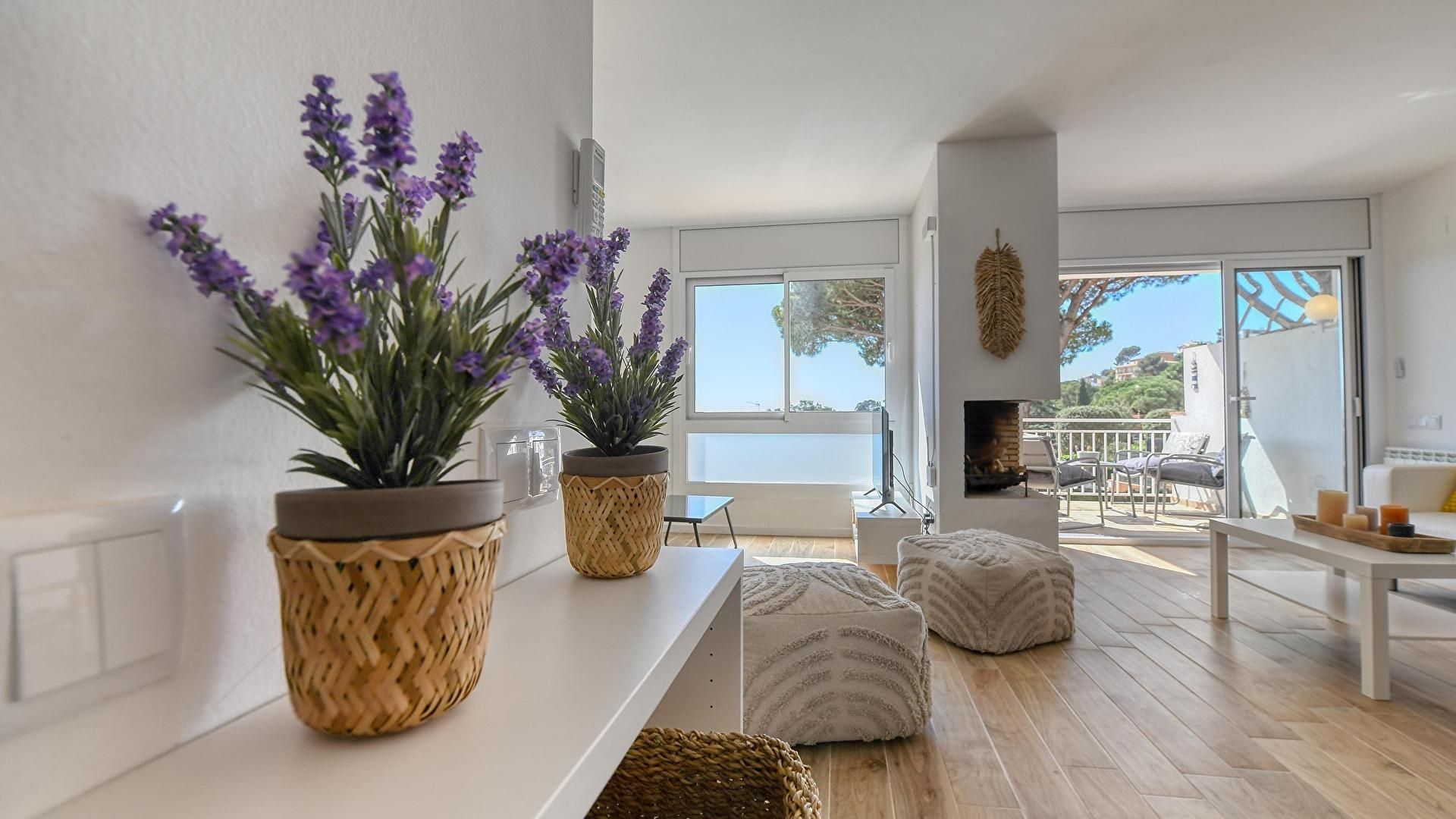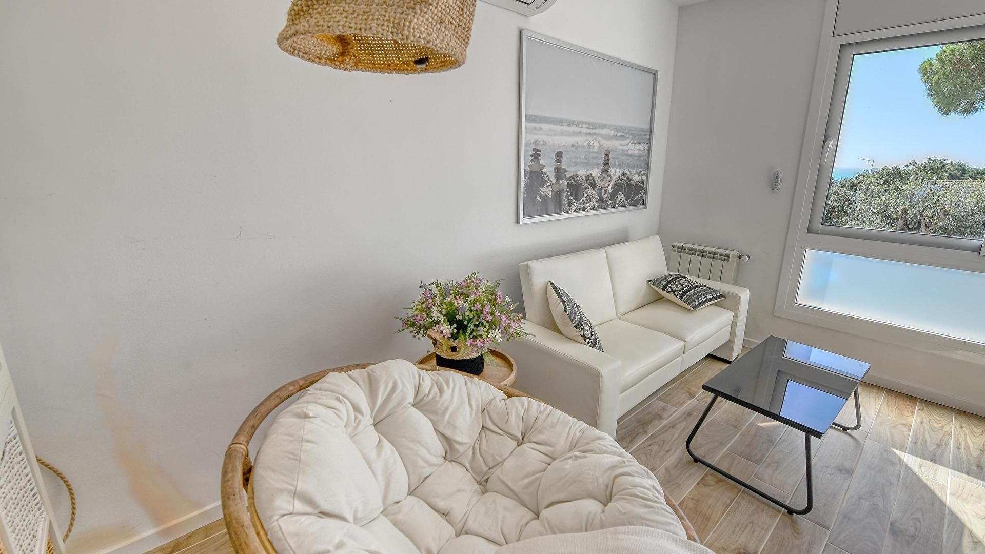 - Salle de séjour avec téléviseur, cheminée, vue sur la mer, sortie sur la terrasse et air conditionnée.