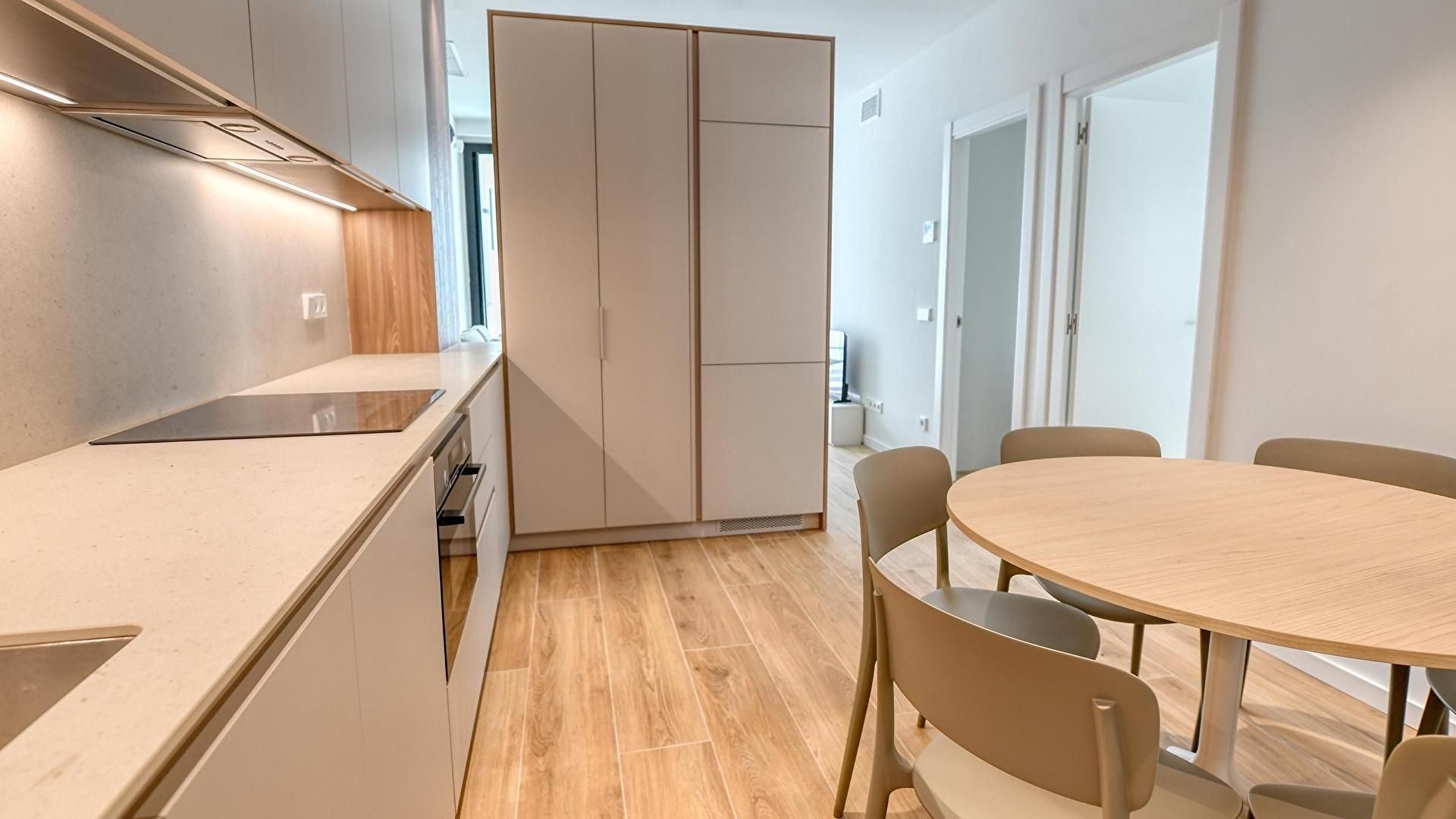 - Cuisine américaine avec plaque de cuisson à induction, four, lave-vaisselle, réfrigérateur combi et machine à laver.