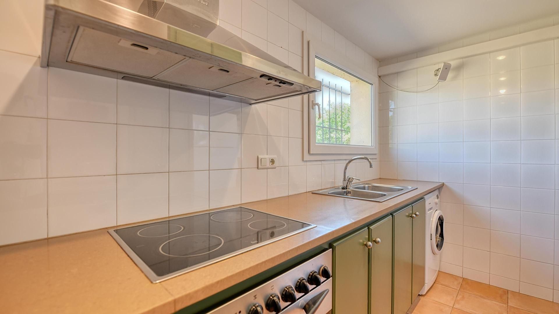 - Cuisine avec plaque de cuisson vitrocéramique, four, micro-ondes, réfrigérateur et machine à laver.