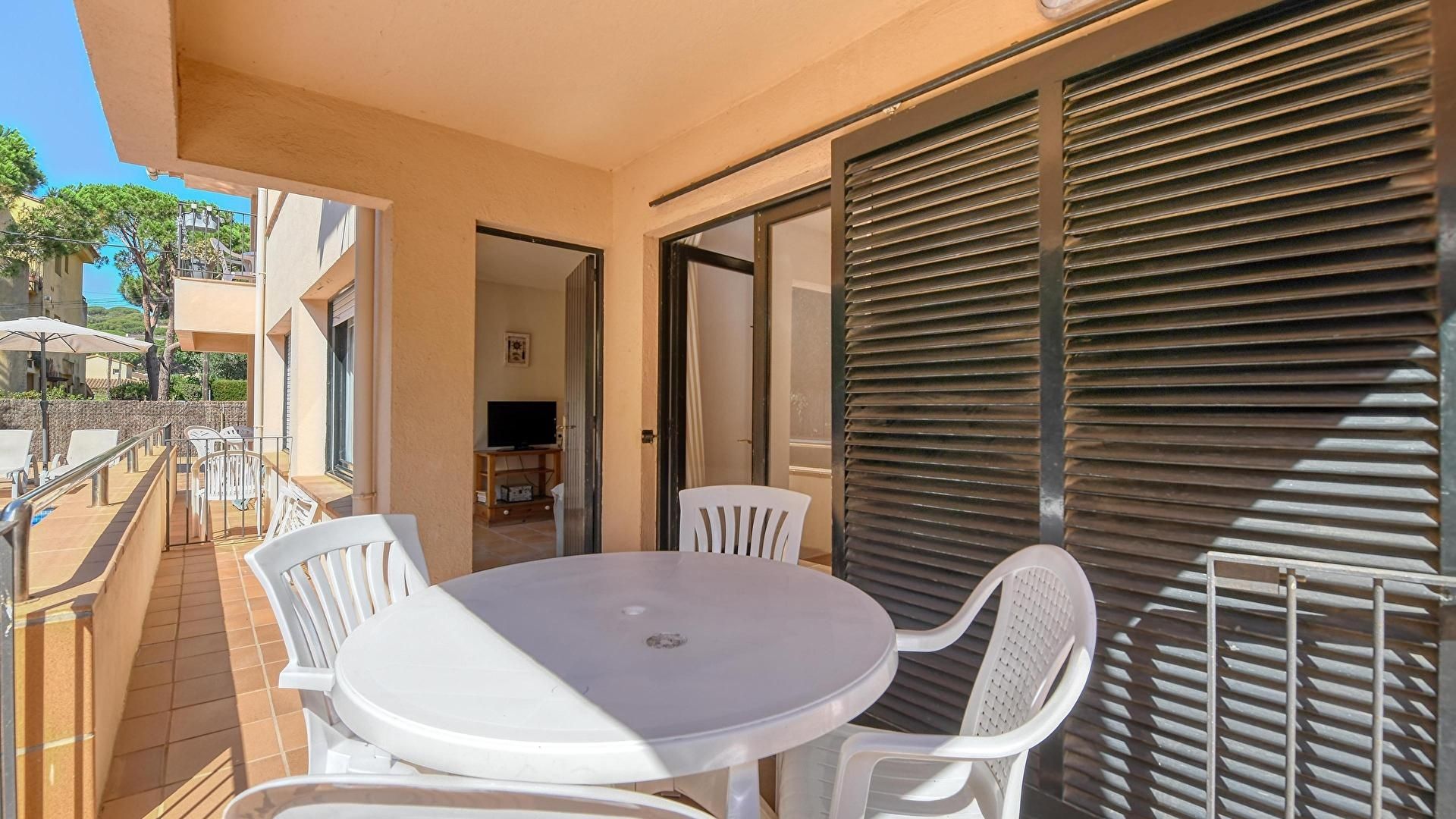 Piscine communautaire et meubles de terrasse.