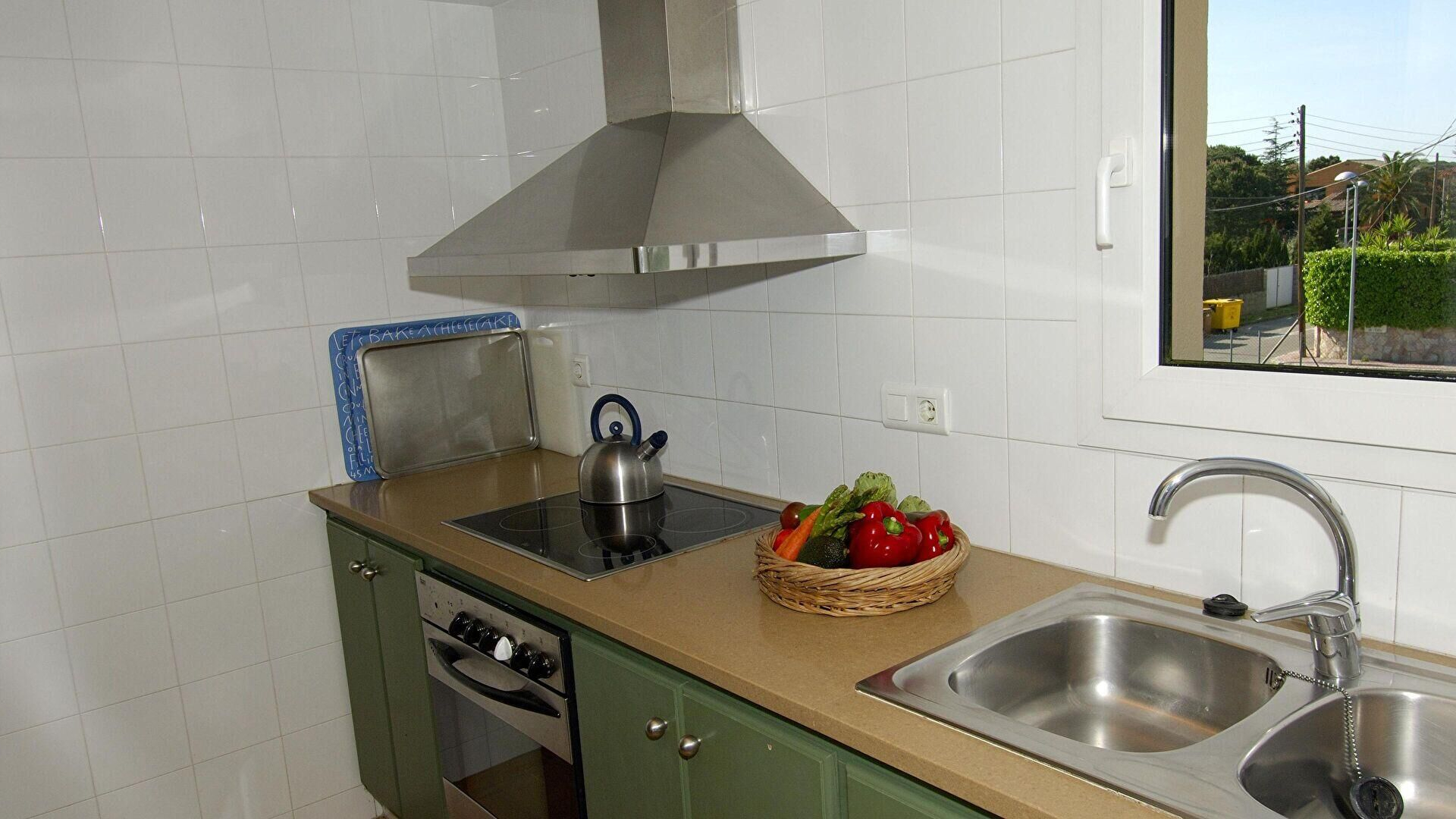 - Cuisine avec plaque de cuisson vitrocéramique, four, micro-ondes, réfrigérateur et machine à laver.