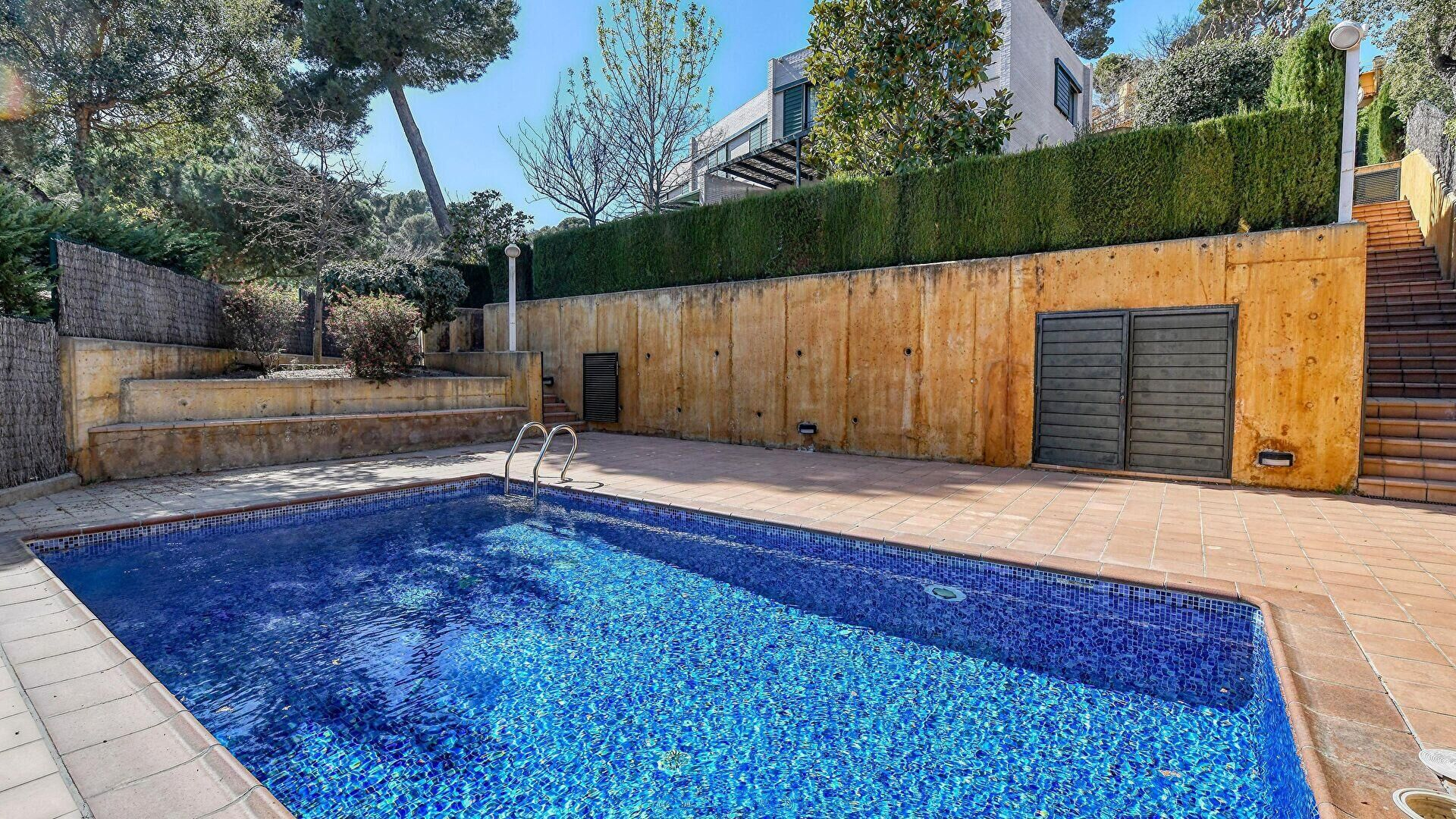 Jardin privé, piscine communautaire et meubles de terrasse.